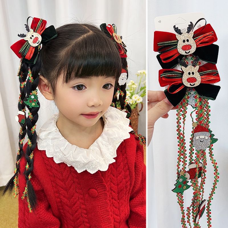 2025年クリスマス新作 エルクとサンタクロースの要素を取り入れたリボンヘアピン 赤と緑のリボン編み込みヘアピンヘアアクセサリー