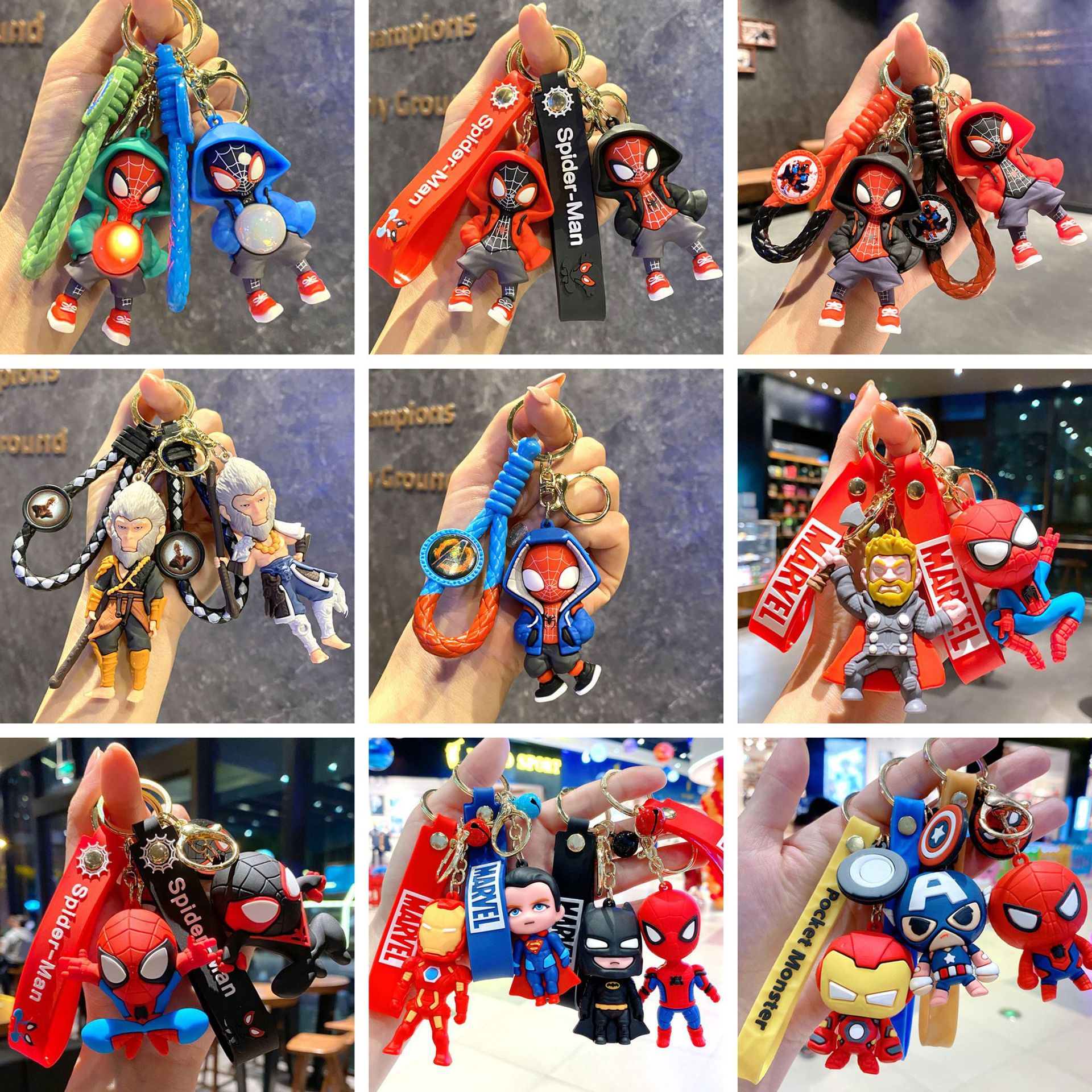 外国貿易の爆発的なガーディアンのスパイダーマンのキーホルダーはロープを編んで車のキーホルダーの子供の机の上で小さい贈り物を押します。