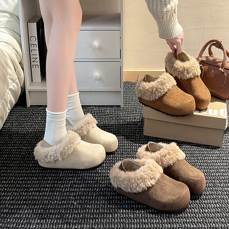 复古简约保暖两穿包头勃肯鞋女2025冬季新款毛毛翻边半拖单鞋外穿