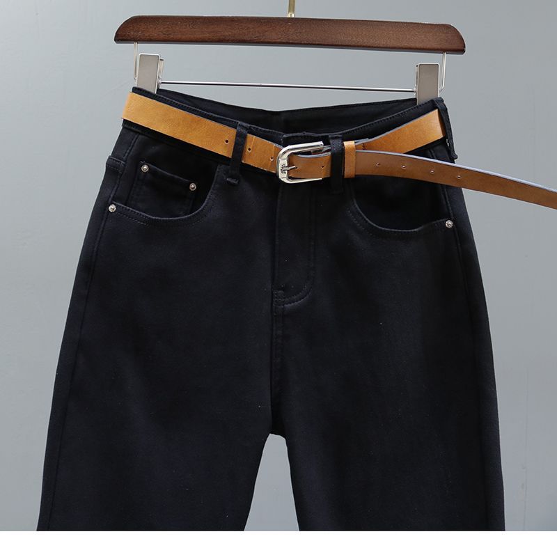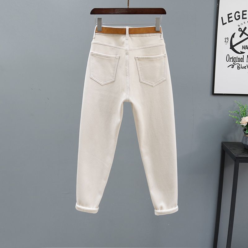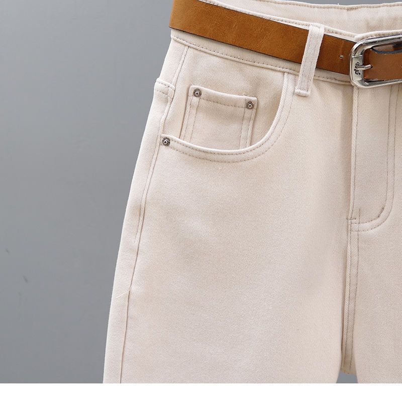 米白色高腰ハレンジーンズ女2024年秋冬ベルベットが痩せている