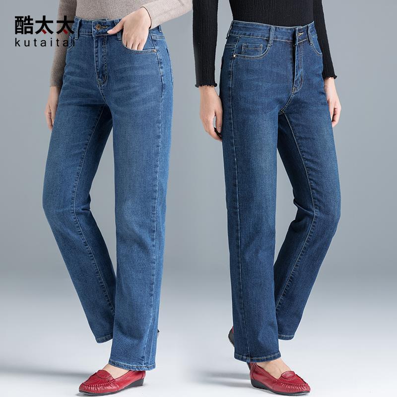秋冬のベルベットの中高年の青いジーンズの女性は腰がゆったりして痩せている