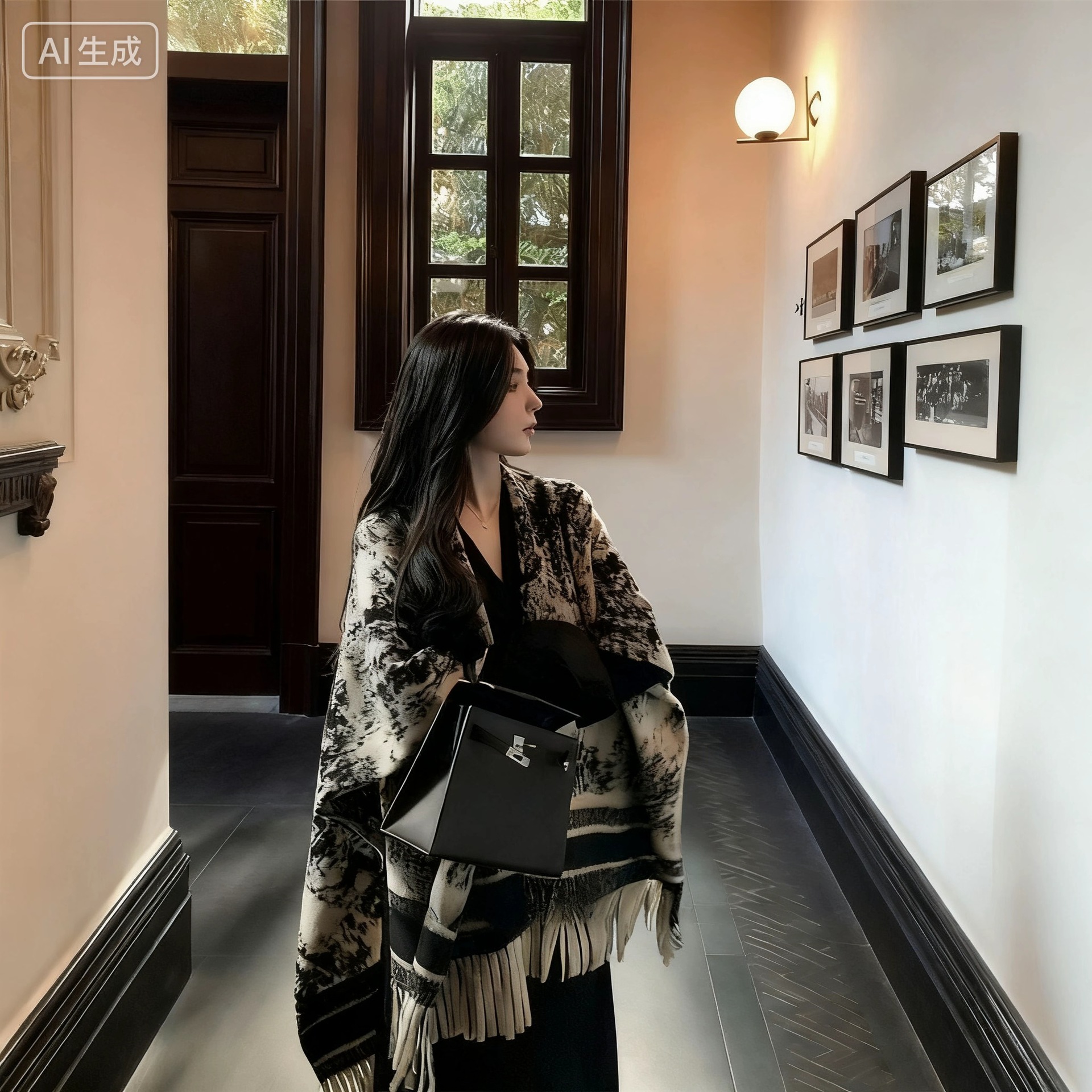 黑白色水墨披肩斗篷女秋冬季外搭高级感韩版百搭加厚保暖围巾批发