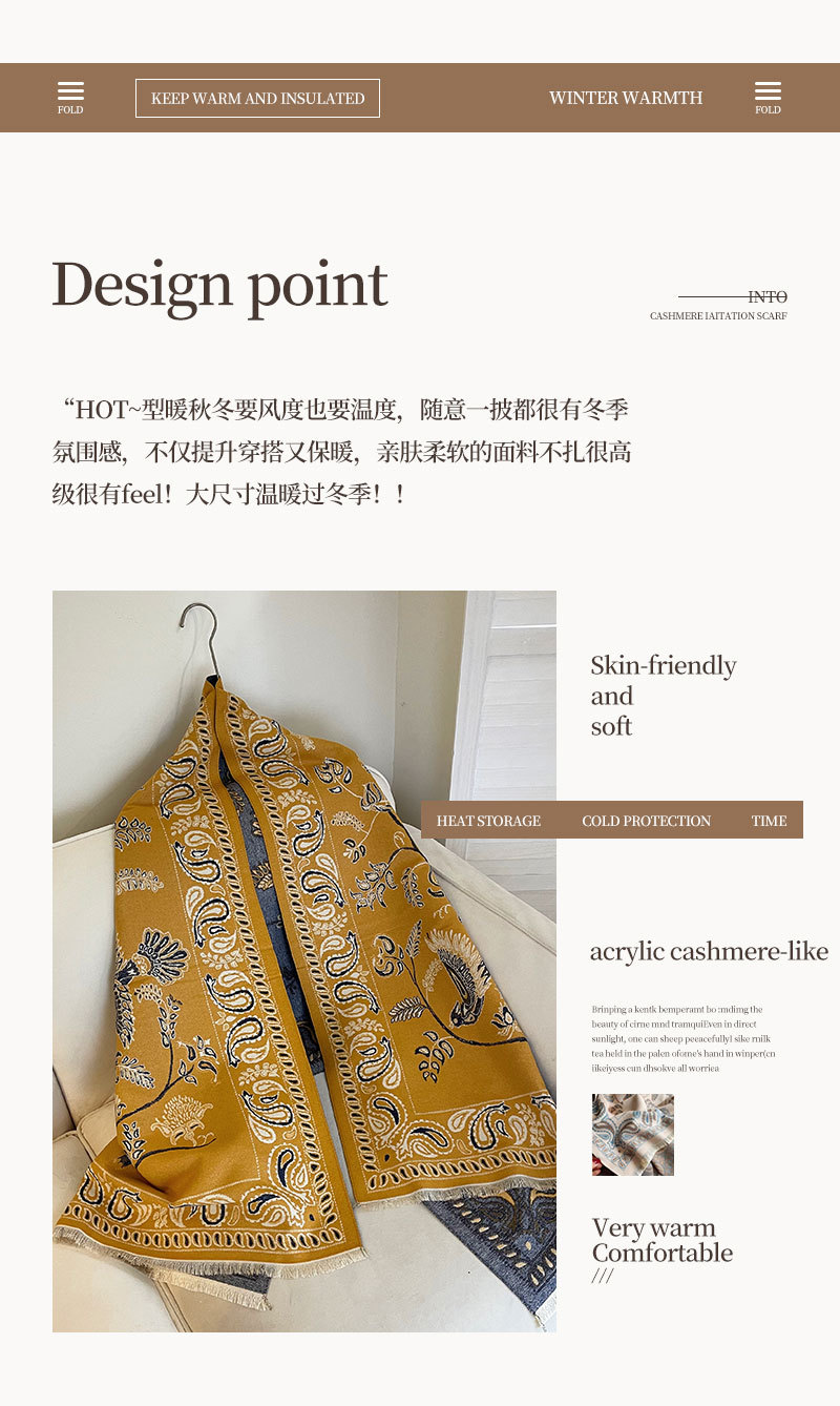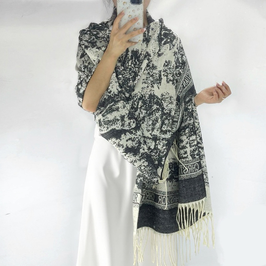 文芸的な水墨画風の質感のカシミヤ風スカーフ 女性用 冬の暖かさ 高級感のある装飾 タッセル付きショール トレンド