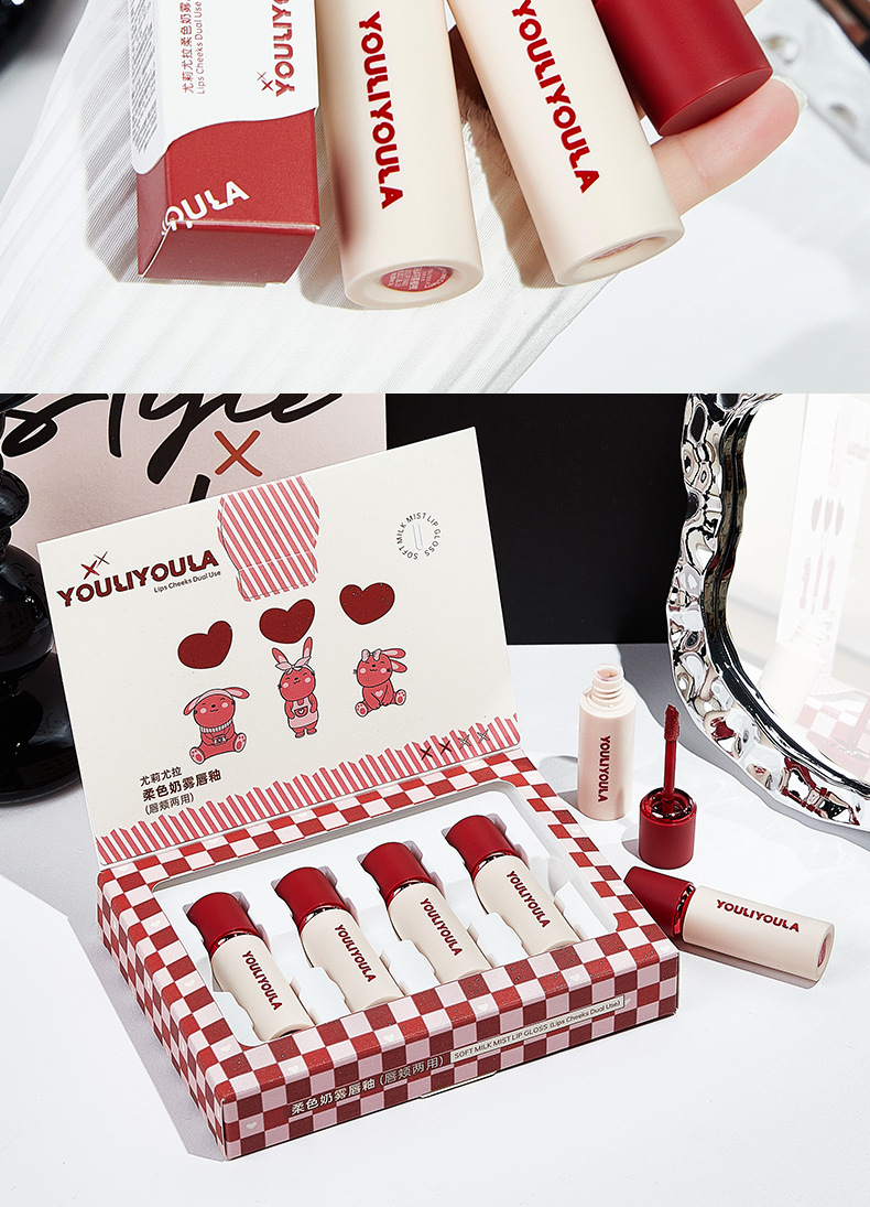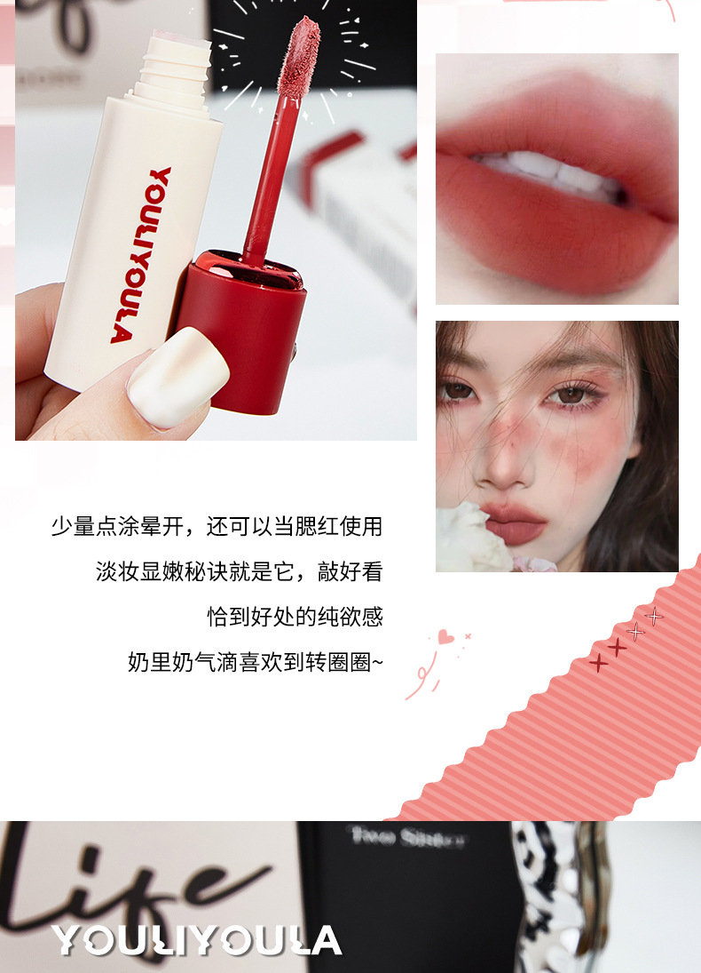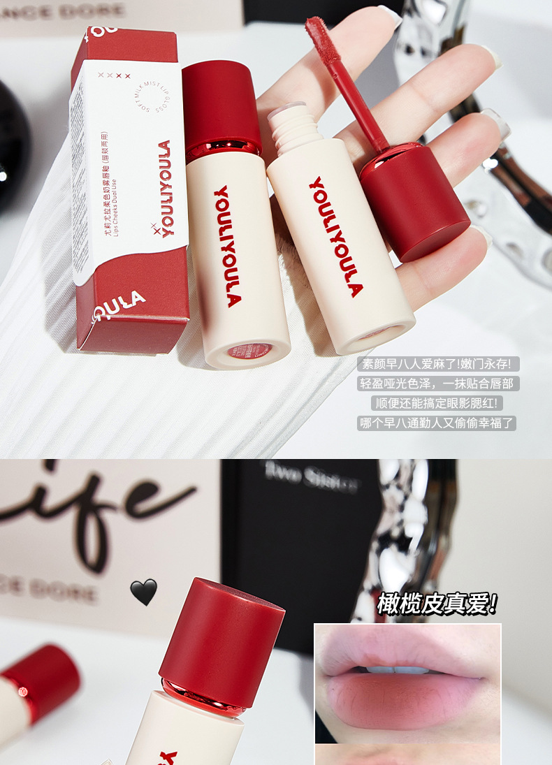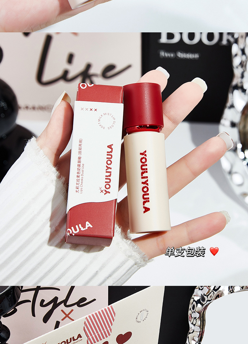 ユリユラの柔らかい色の乳の霧の唇の釉薬のベルベットの滑らかな唇の頬の両用のすっぴんの白い雰囲気感のチークの口紅