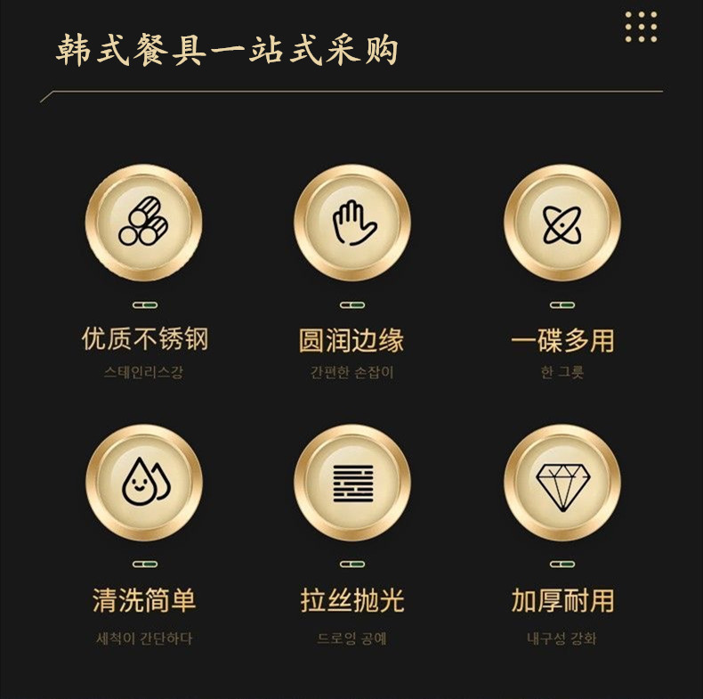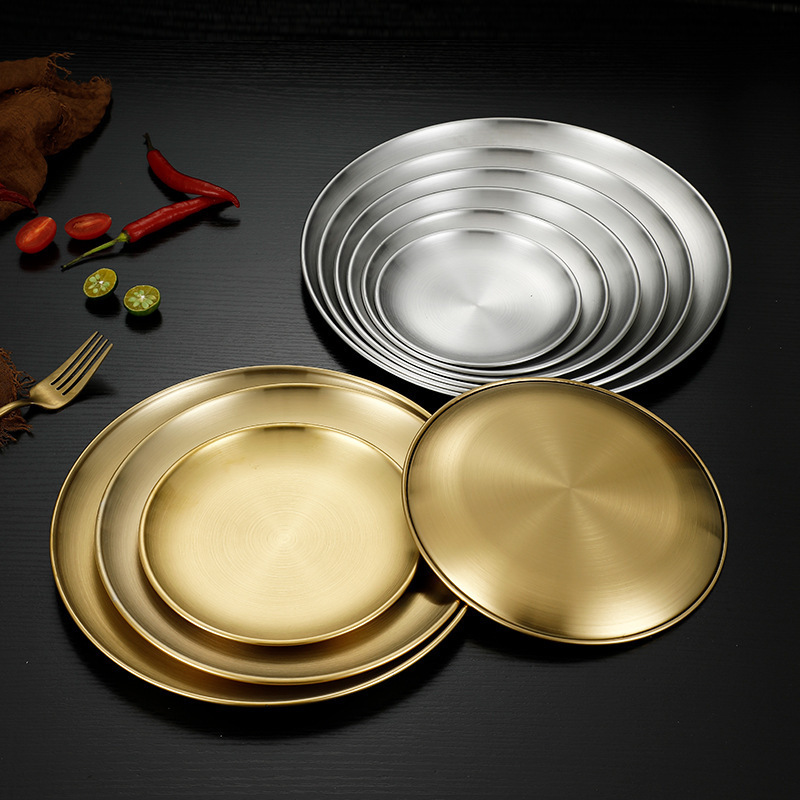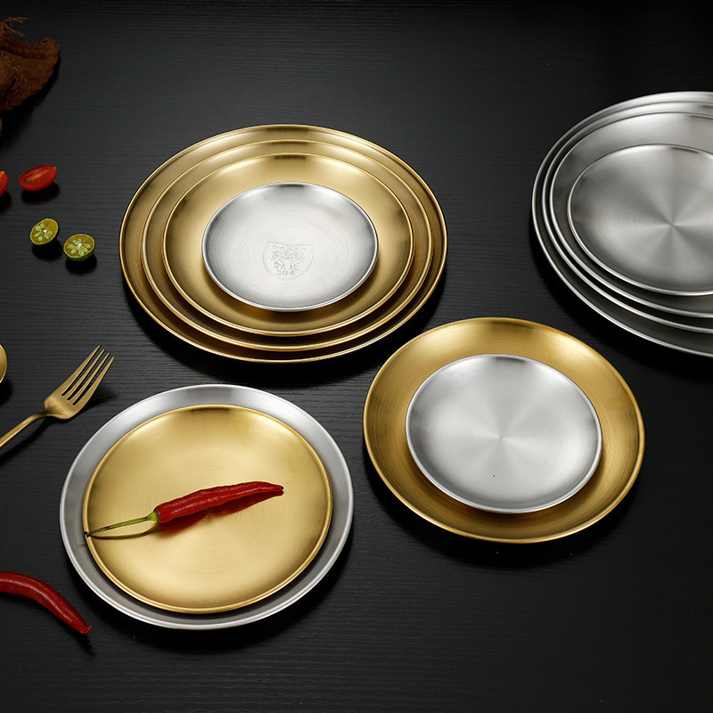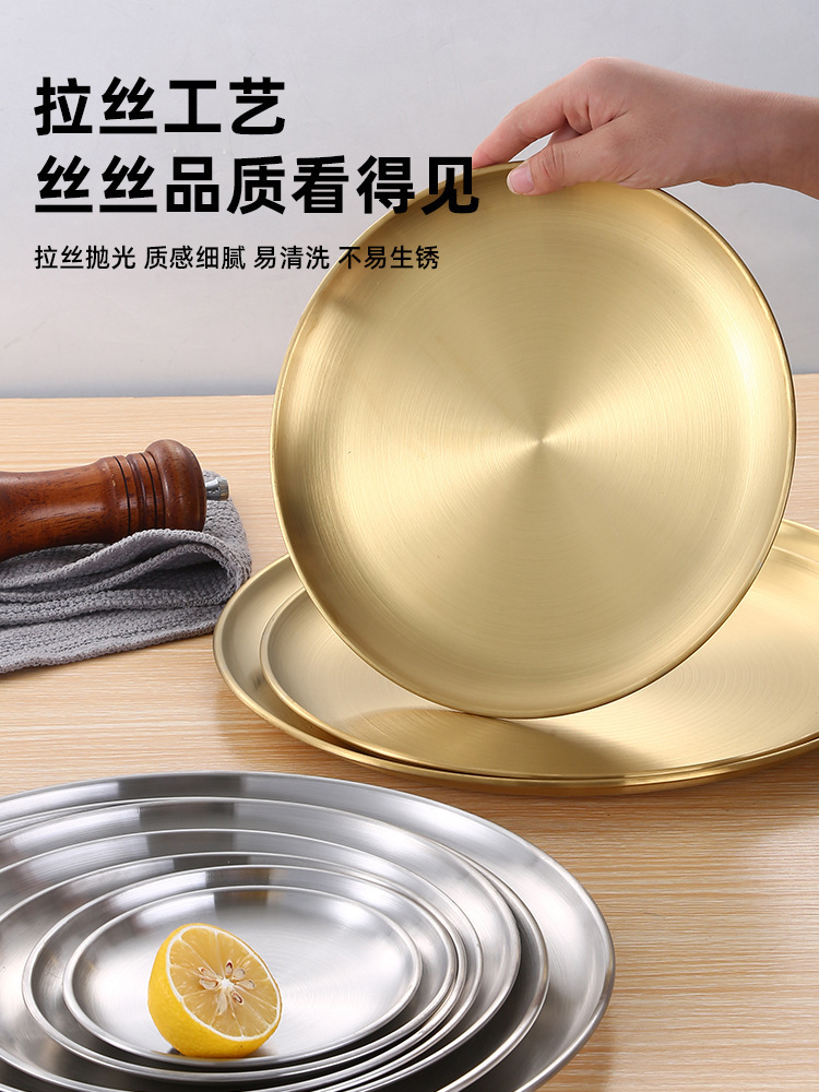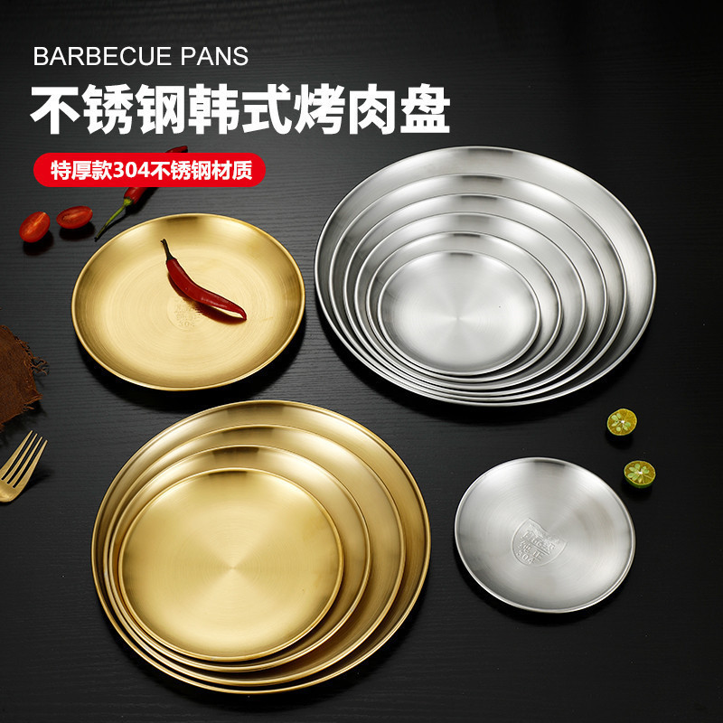 韓国式焼肉皿304ステンレス円盤厚い金色のトレーのフラット皿家庭用スナック皿円形皿