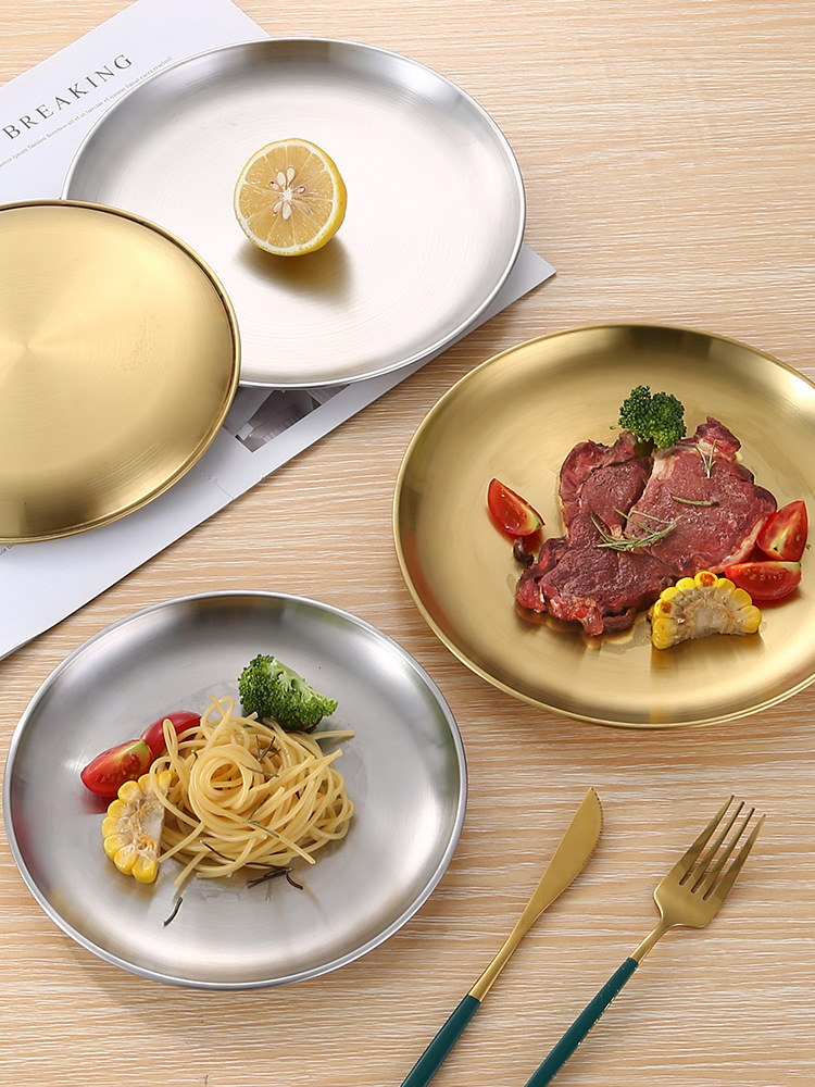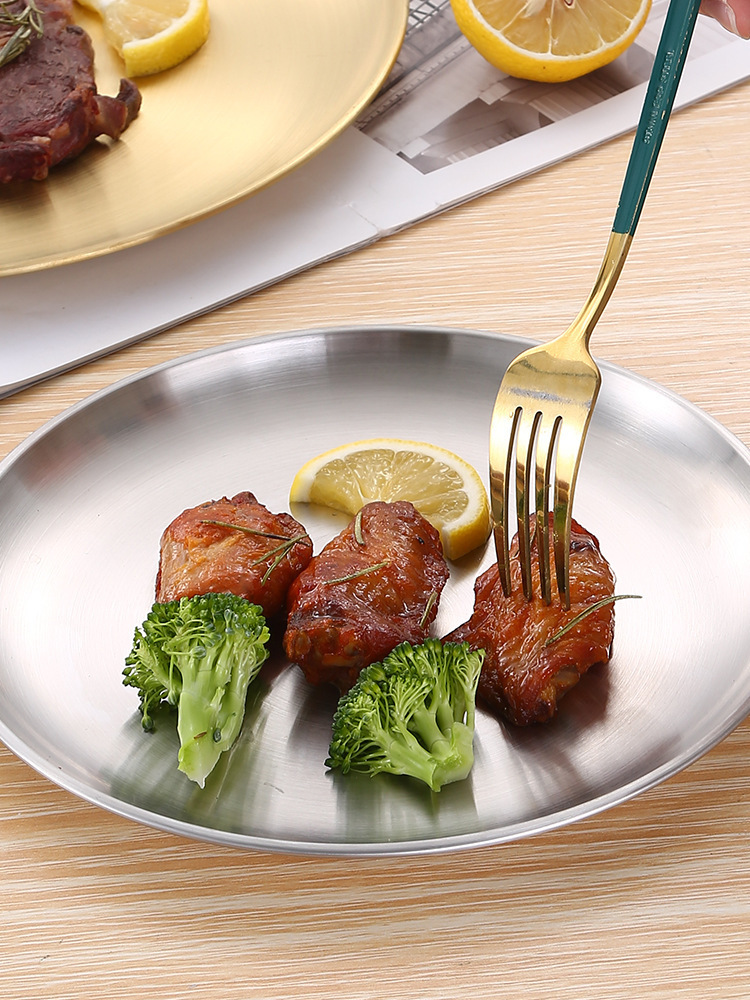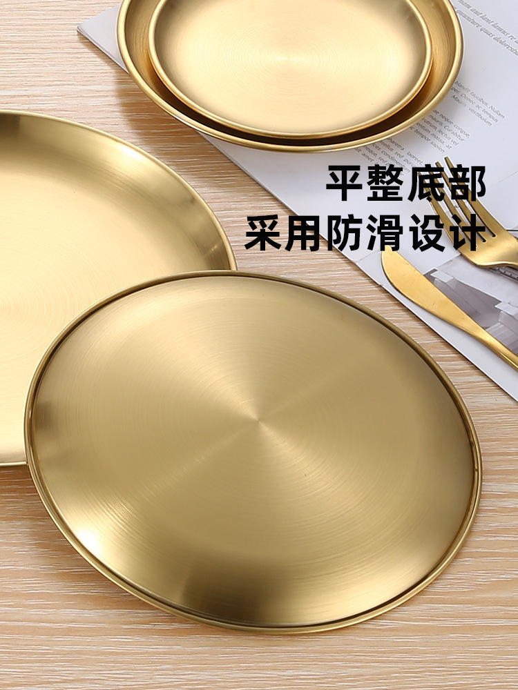 淄博バーベキュー韓国式ステンレス厚手円盤焼肉皿金色カフェ果物ケーキ皿骨皿焼き