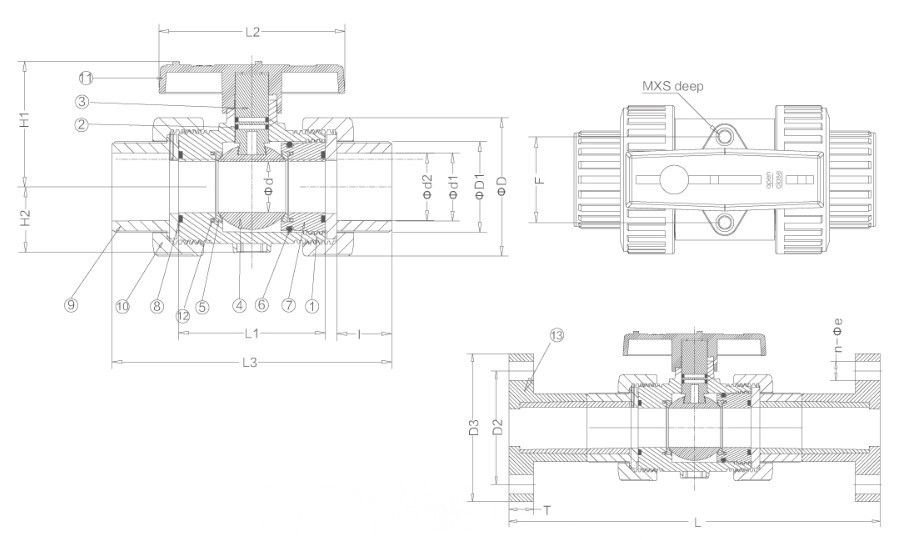 ♦ 球阀阀体材质:UPVC、PPH、CPVC、PVDF