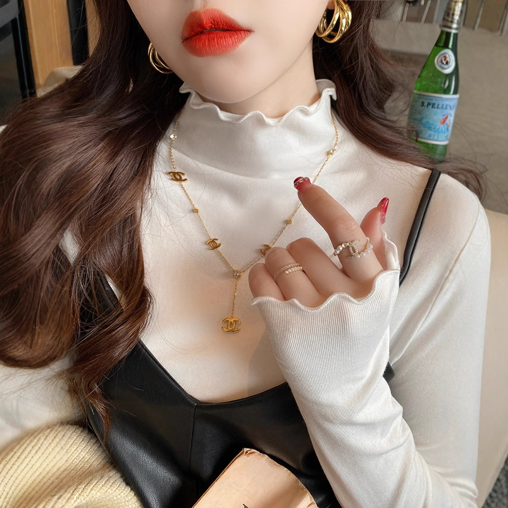 半高襟の木の耳元の女性の徳の絨毯の底のシャツの2024の新型の春と秋の冬のメリヤスの純色の長袖のtシャツの上着