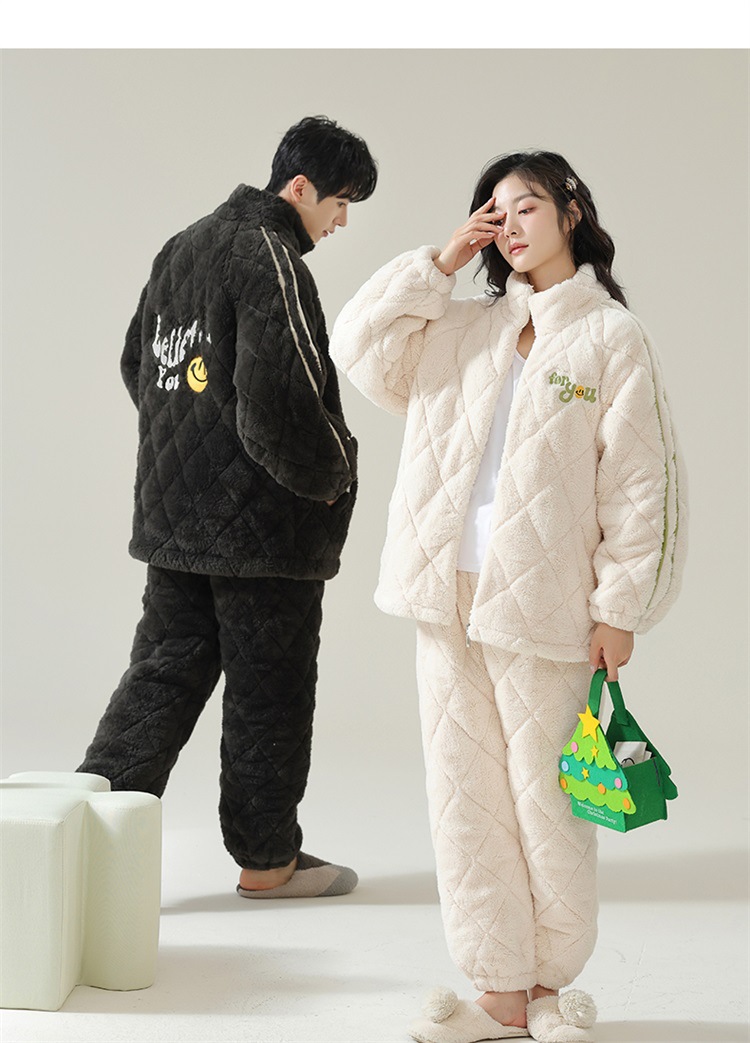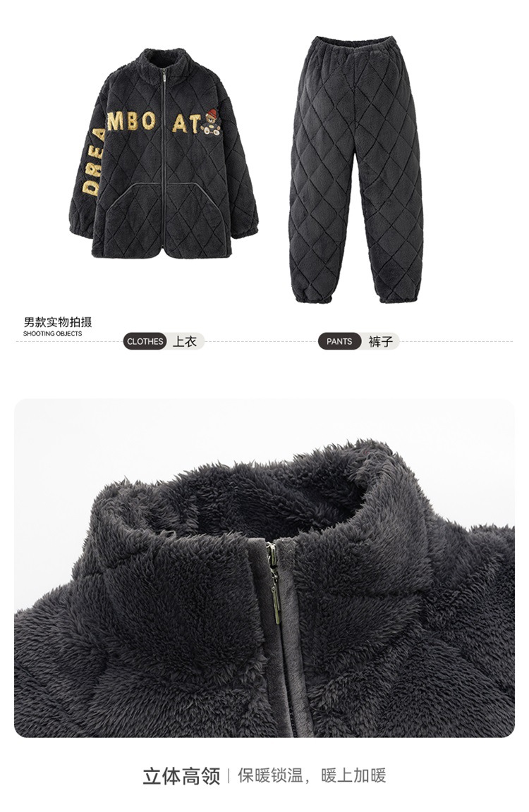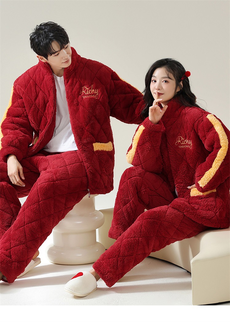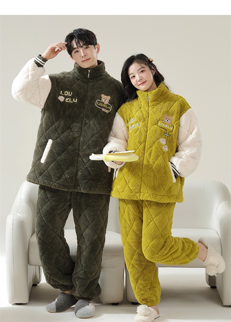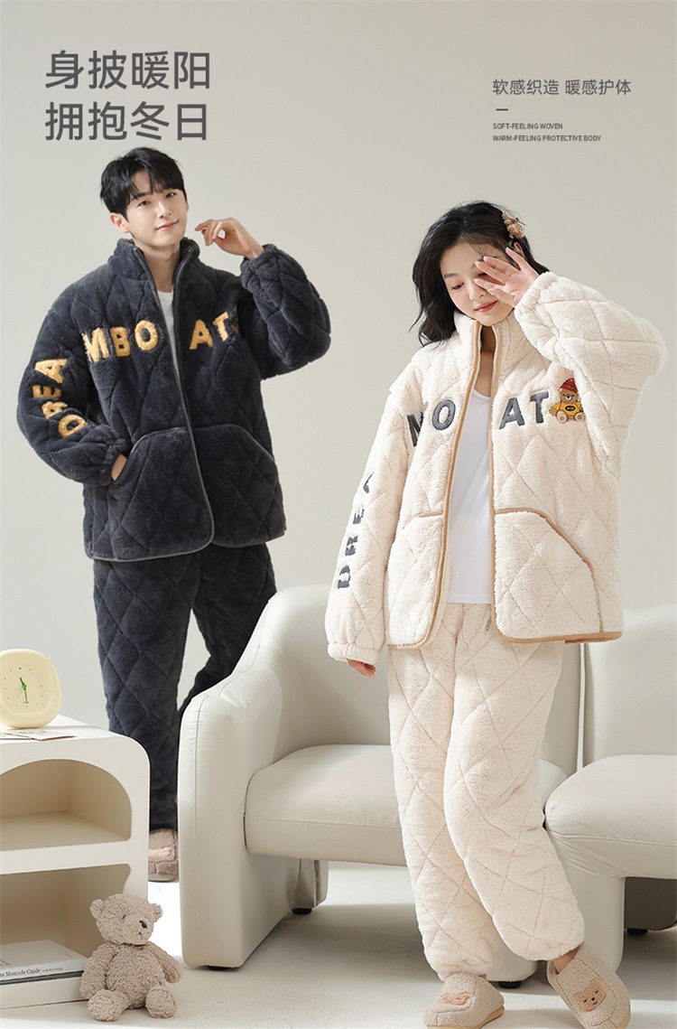 珊瑚绒三层夹棉情侣立领睡衣冬季男女款加绒加厚可外穿家居服冬天