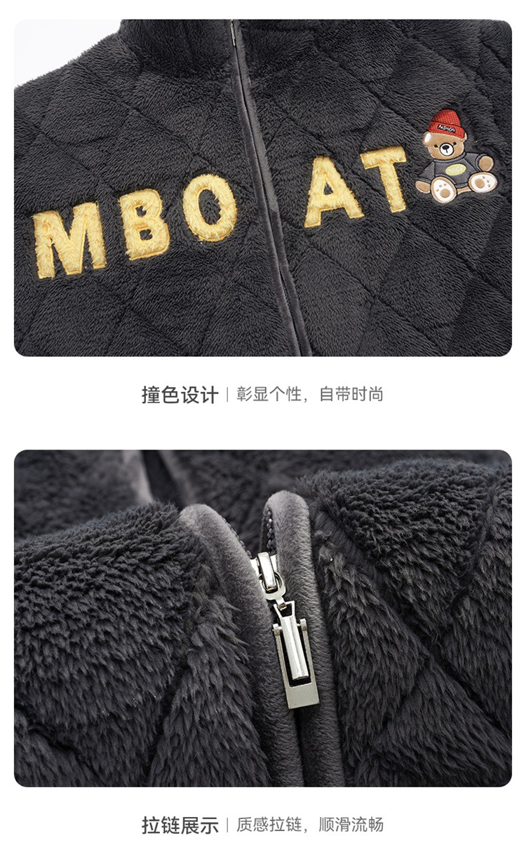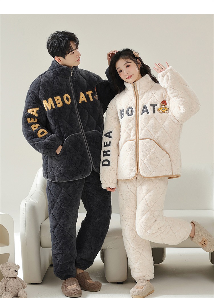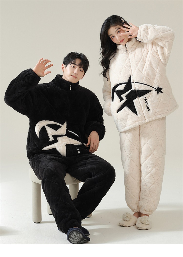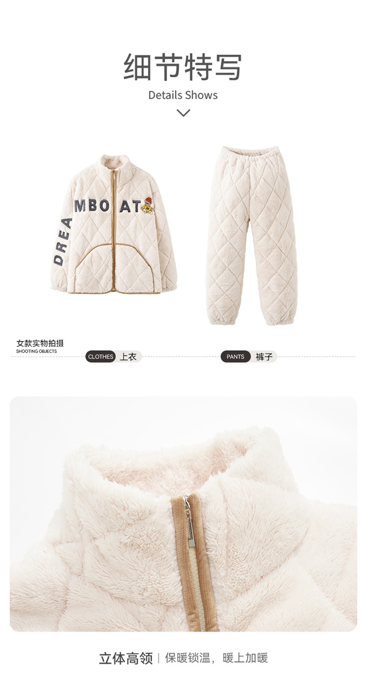 珊瑚绒三层夹棉情侣立领睡衣冬季男女款加绒加厚可外穿家居服冬天