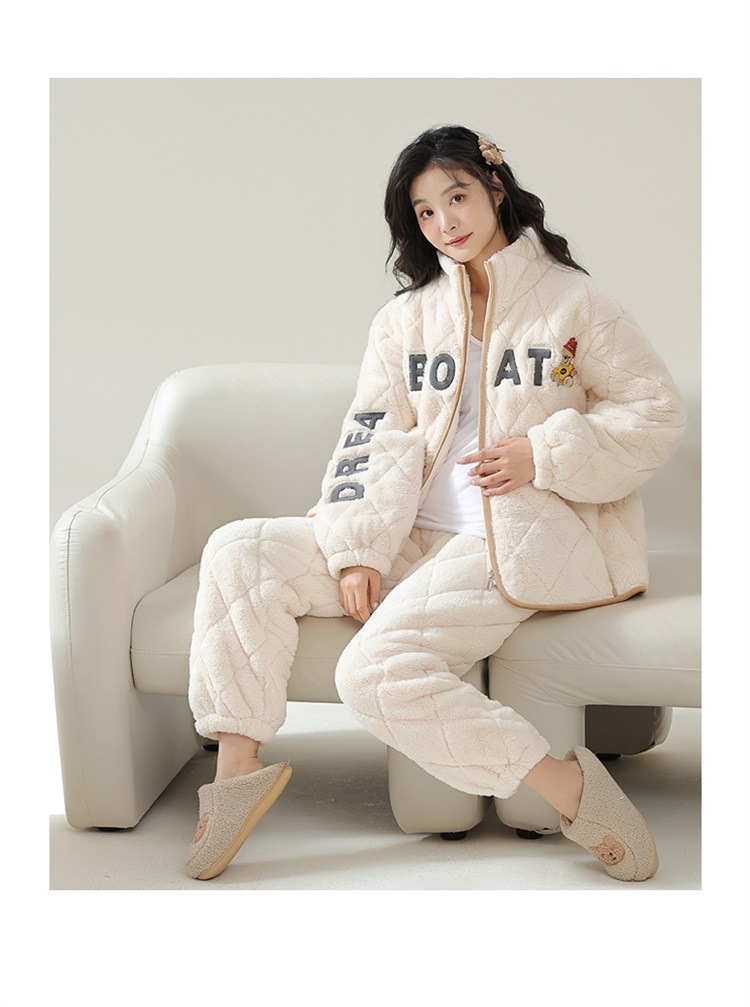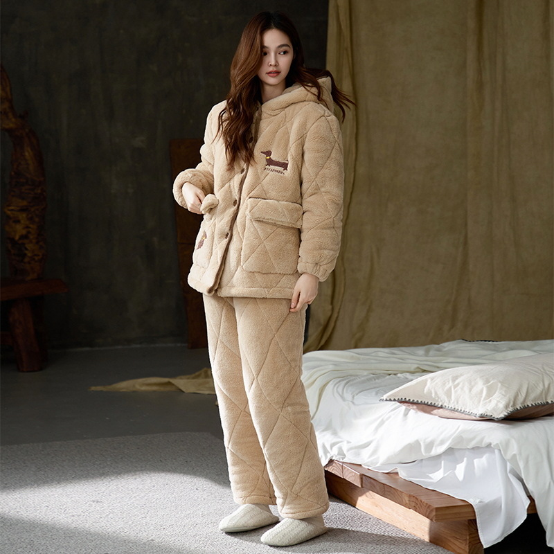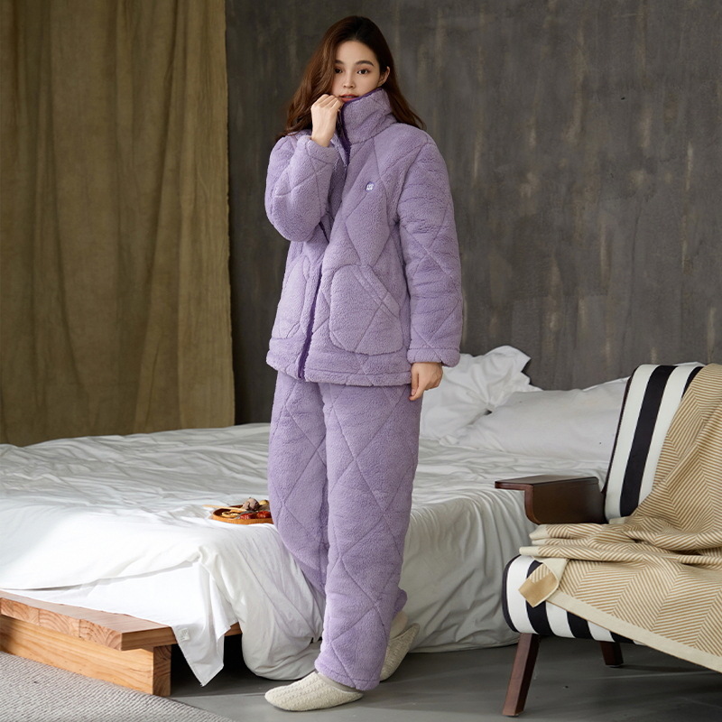 冬季保暖三层夹棉女士珊瑚绒睡衣女加厚保暖可外穿法兰绒家居服