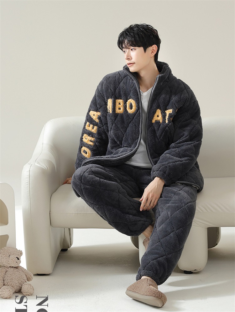 冬のワンピースパジャマ男性三層サンゴのベルベットは綿を挟んで冬に男性の保温家の上着を厚くして着る