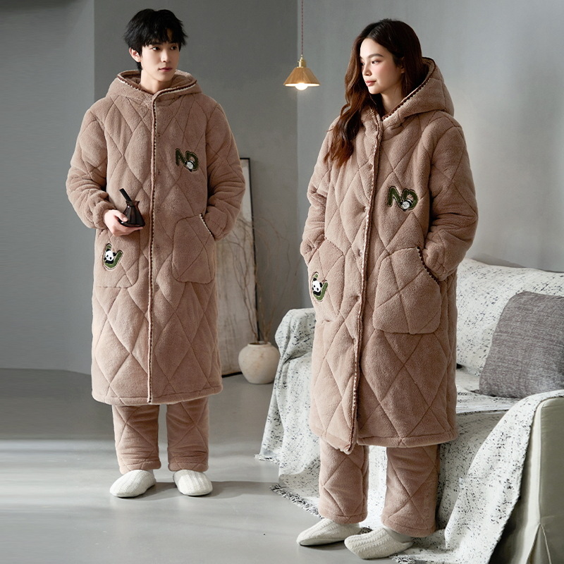 珊瑚绒三层夹棉情侣睡衣男女冬季加绒加厚睡袍睡裤保暖家居服套装