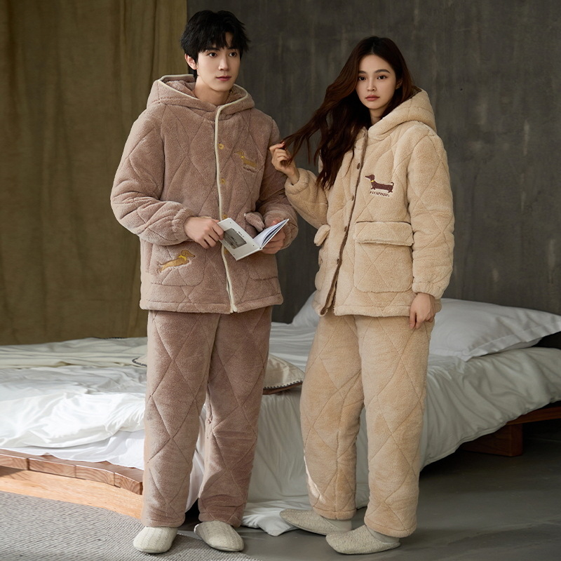 綿を挟んだパジャマカップル冬の新型三層ベルベットは保温サンゴベルベットの家庭服冬の男女セットを厚くした