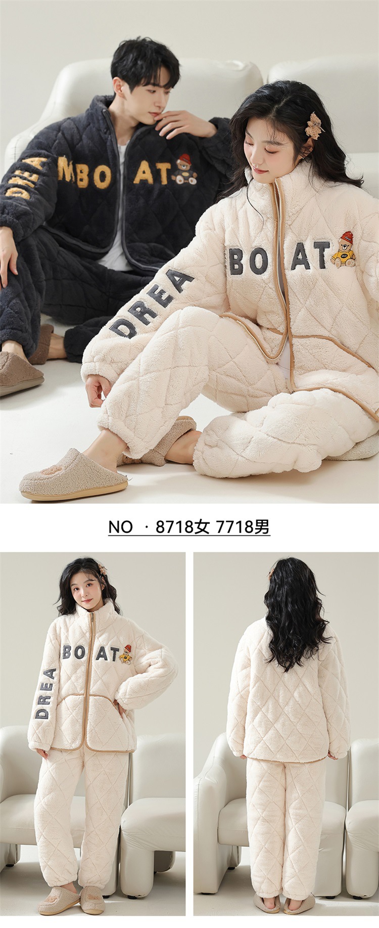 冬季睡衣情侣加绒加厚三层夹棉珊瑚绒保暖卡通可外穿情侣家居服