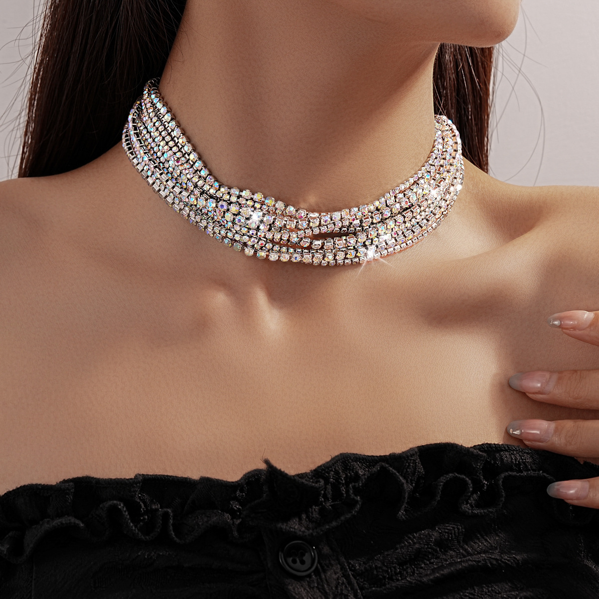 彩光满钻镶钻多层项链欧美夸张个性时尚锁骨链轻奢高级感项饰批发