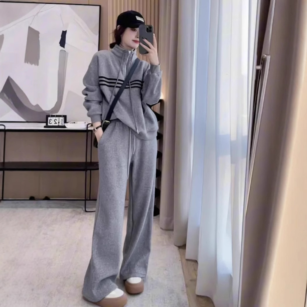 春の新型グレーカジュアルスポーツスーツ女性高級感ファッション半ファスナー衛衣高腰衛ズボン2点セット