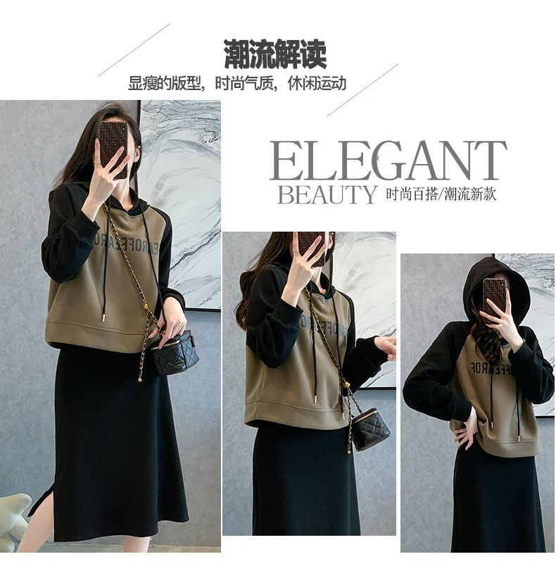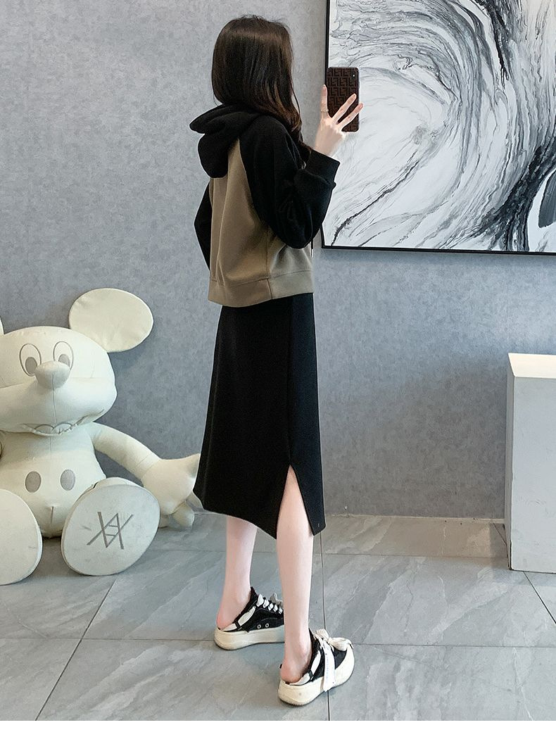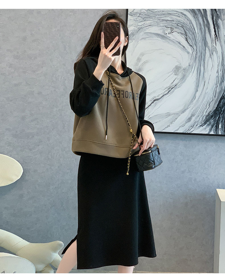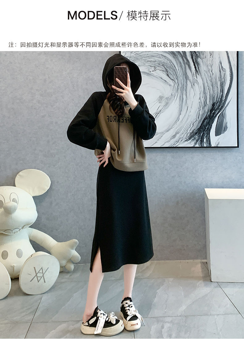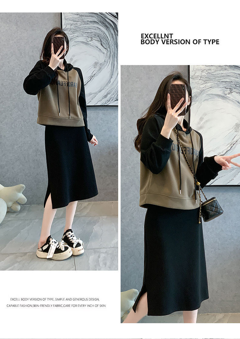 新款韩版春秋短款运动休闲套装女灰色连帽卫衣显瘦开叉半身裙套装