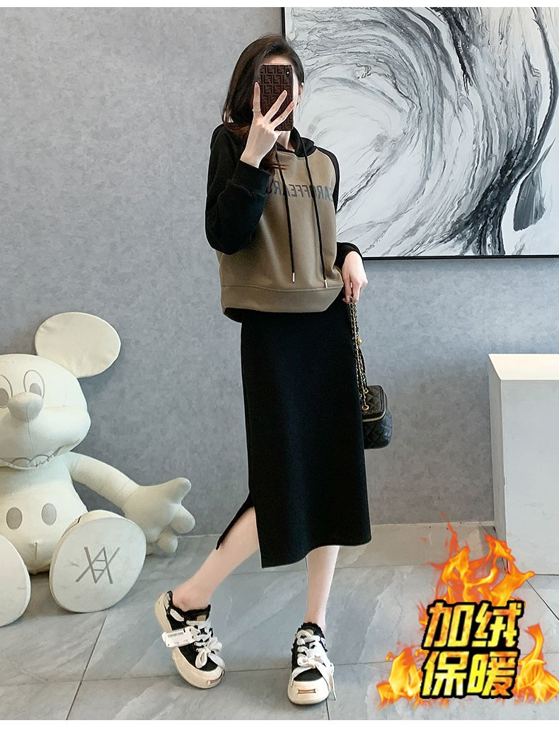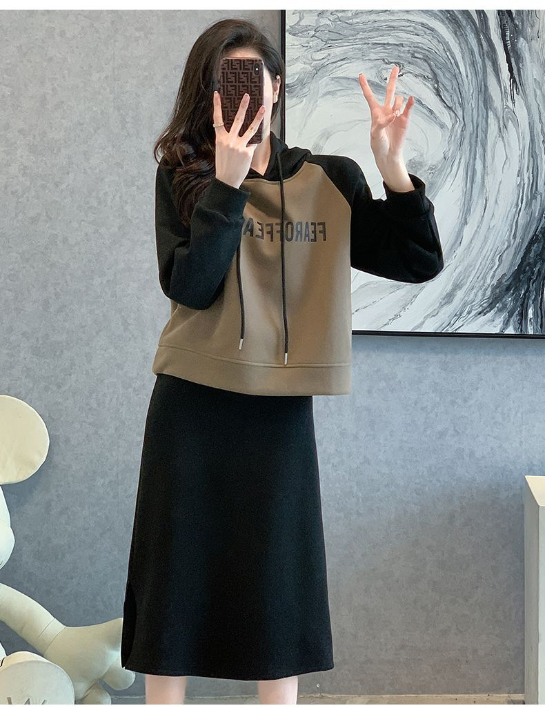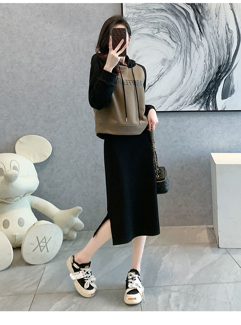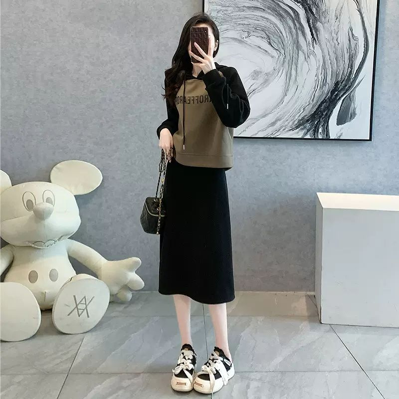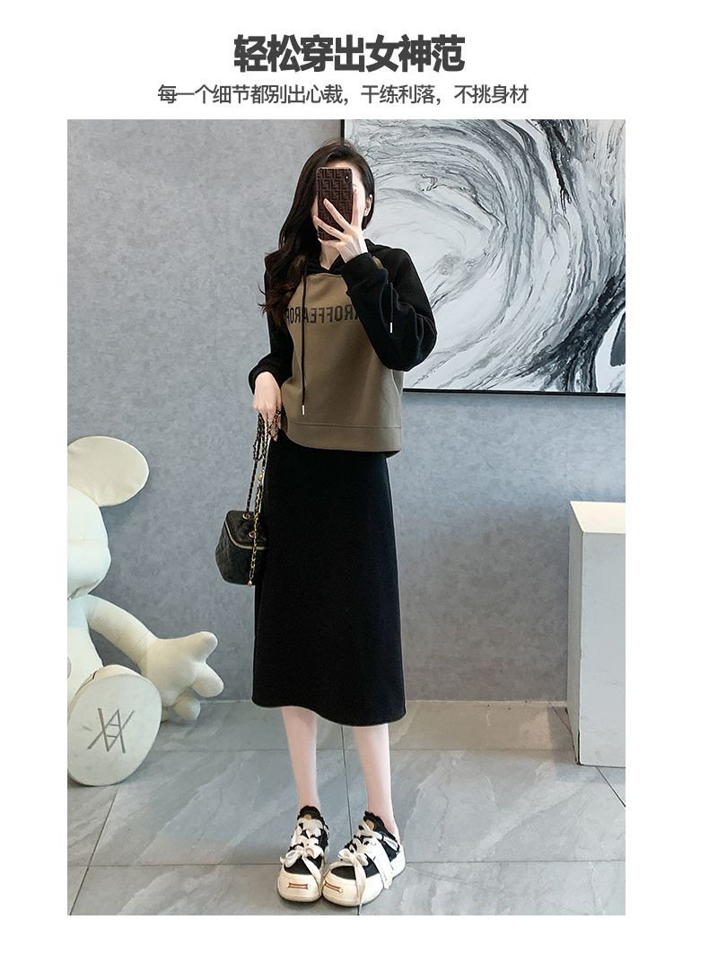 新款韩版春秋短款运动休闲套装女灰色连帽卫衣显瘦开叉半身裙套装