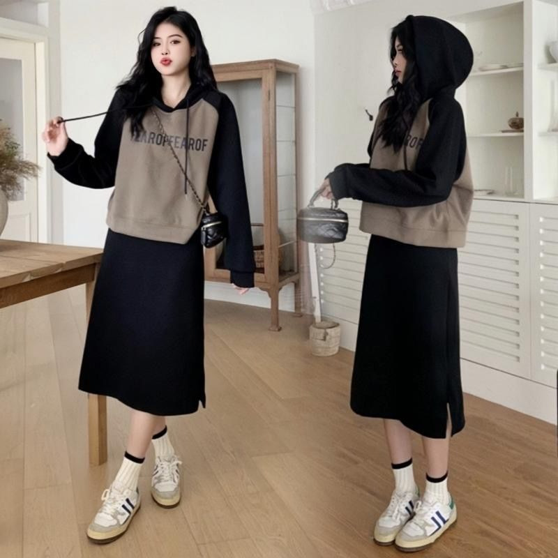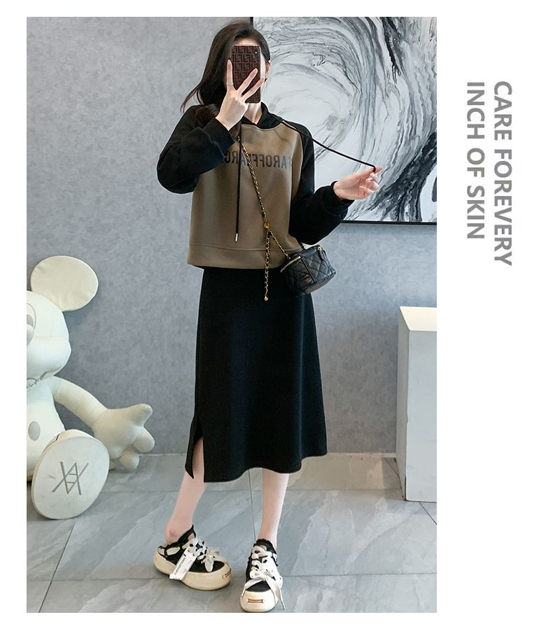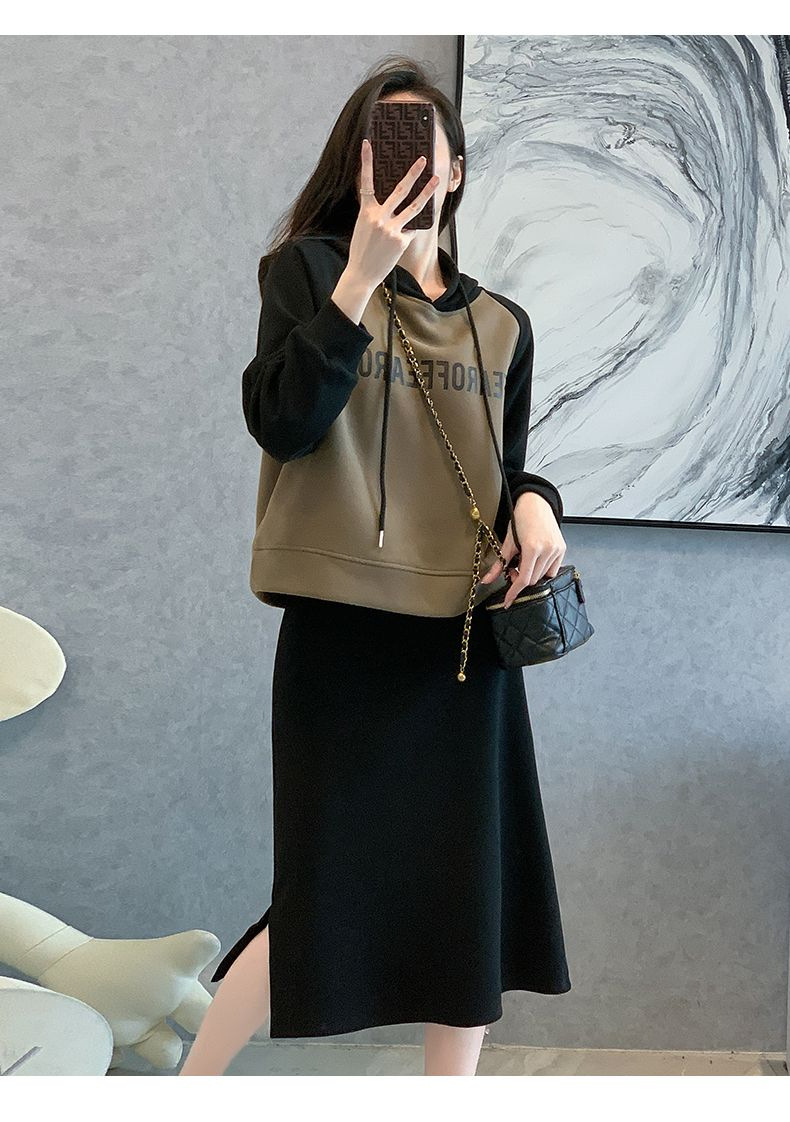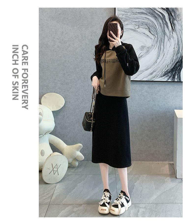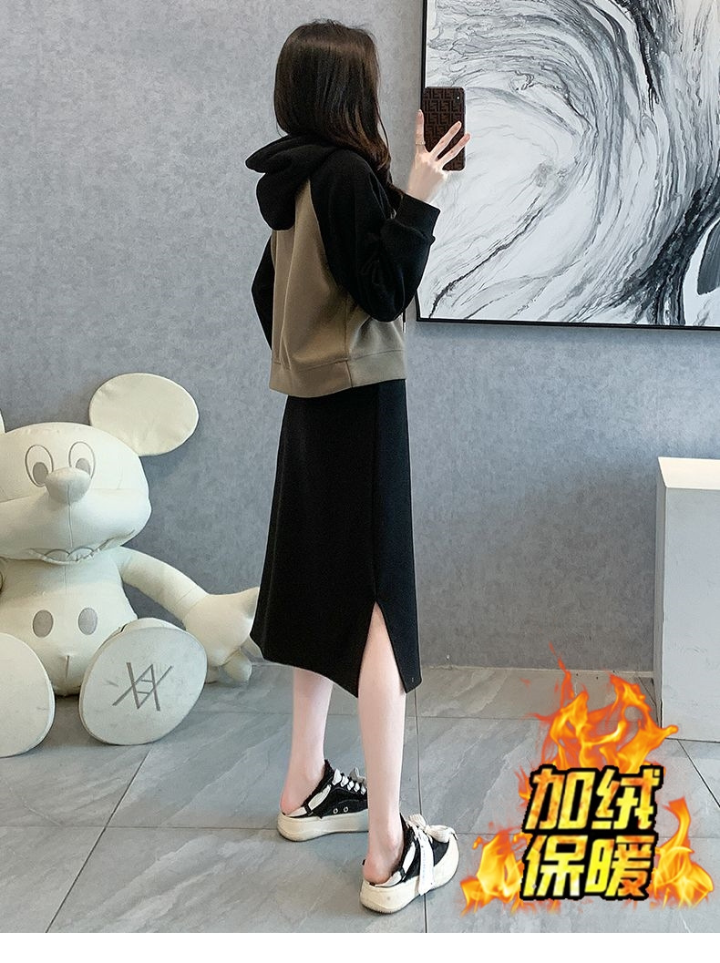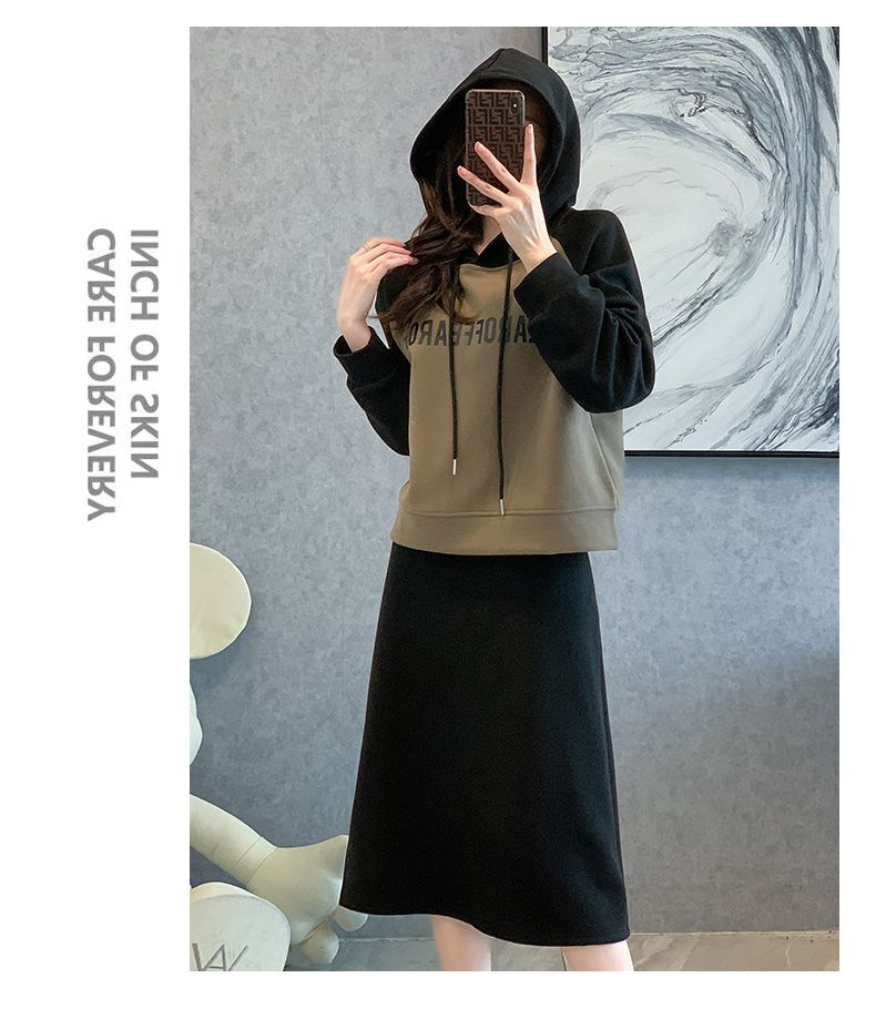 新款韩版春秋短款运动休闲套装女灰色连帽卫衣显瘦开叉半身裙套装