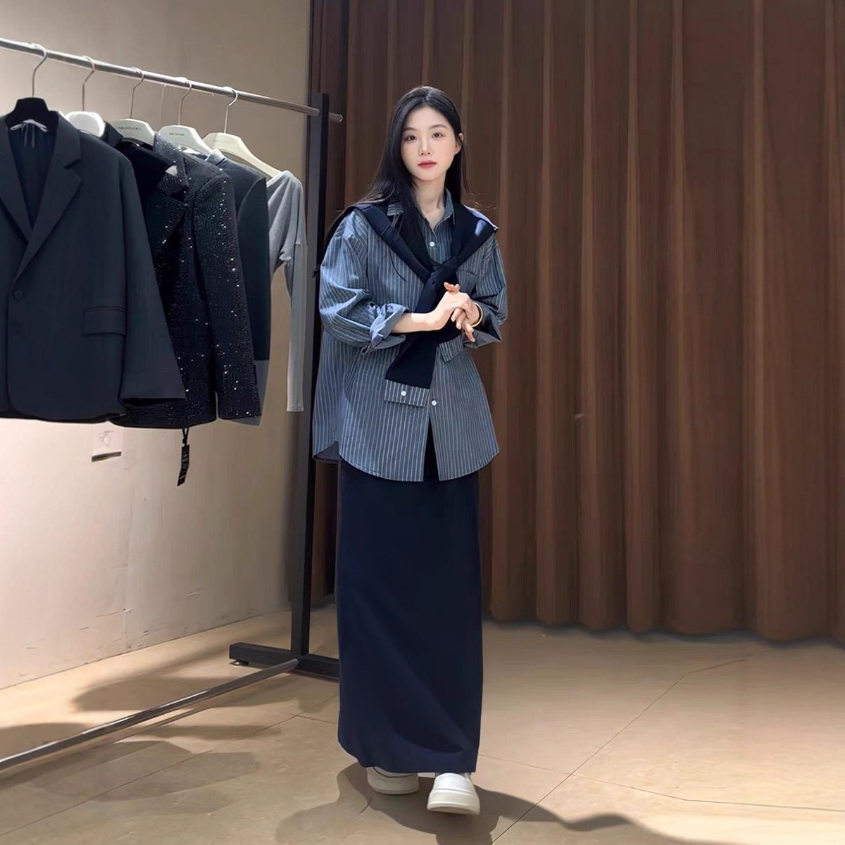 韩系学院风风格穿搭一整套女春秋季中长款半身裙披肩衬衫时尚套装