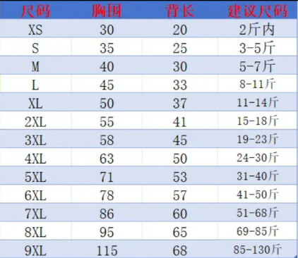 サイズ XS バスト 30 (内側 1.0kg ) トラクション バックル付き,S バスト 35( 1.5-2.5kg ) トラクションバックル付き,M バスト 40( 2.5-3.5kg ) トラクションバックル付き,L バスト 45( 4-5.5kg ) トラクションバックル付き,XL バスト 50( 5.5-7kg ) トラクションバックル付き,2XL バスト 55 ( 7.5-9kg ) トラクションバックル付き,3XL バスト 58 ( 9.5-11.5kg ) トラクションバックルなし,4XL バスト 63 ( 12-15kg ) トラクションバックルなし,5XL バスト 71 ( 15.5-20kg ) トラクションバックルなし,6XL バスト 78 ( 20.5-25kg ) トラクションバックルなし,7XL バスト 86 ( 25.5-34kg ) トラクションバックルなし,8XL バスト 95 ( 34.5-42.5kg ) トラクションバックルなし,9XL バスト 115 ( 42.5-65kg ) トラクションバックルなし