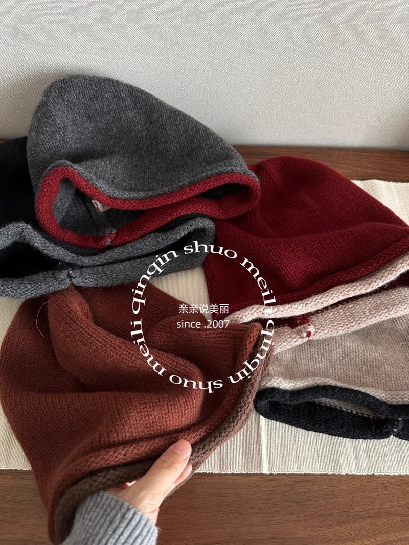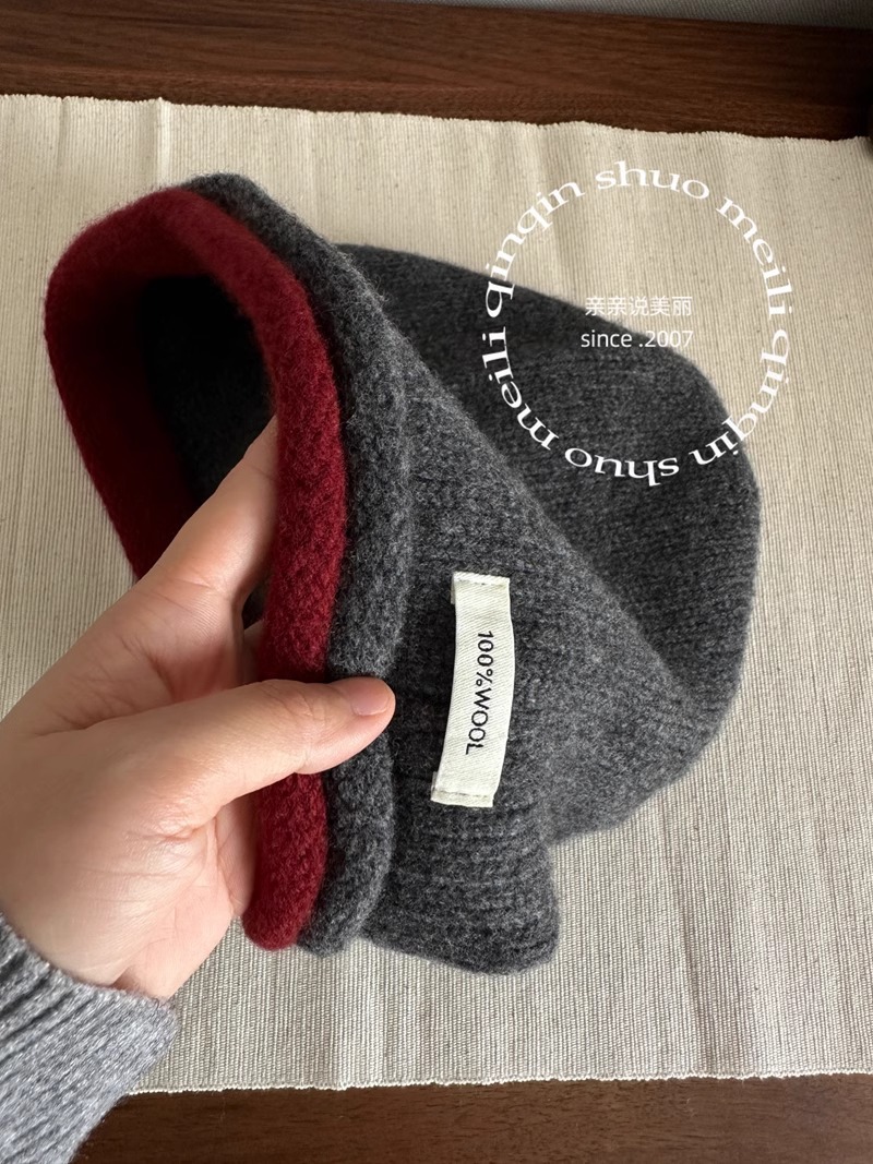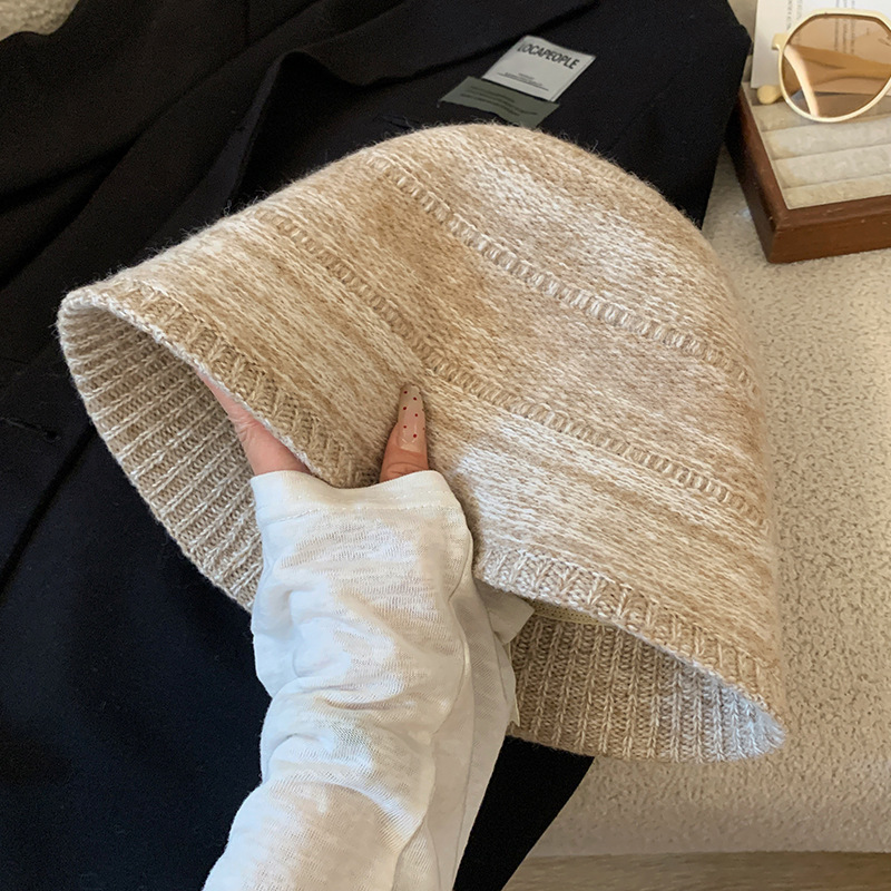 出韩国款羊毛针织卷边水桶帽子女秋冬复古咖色大头围套头帽渔夫帽