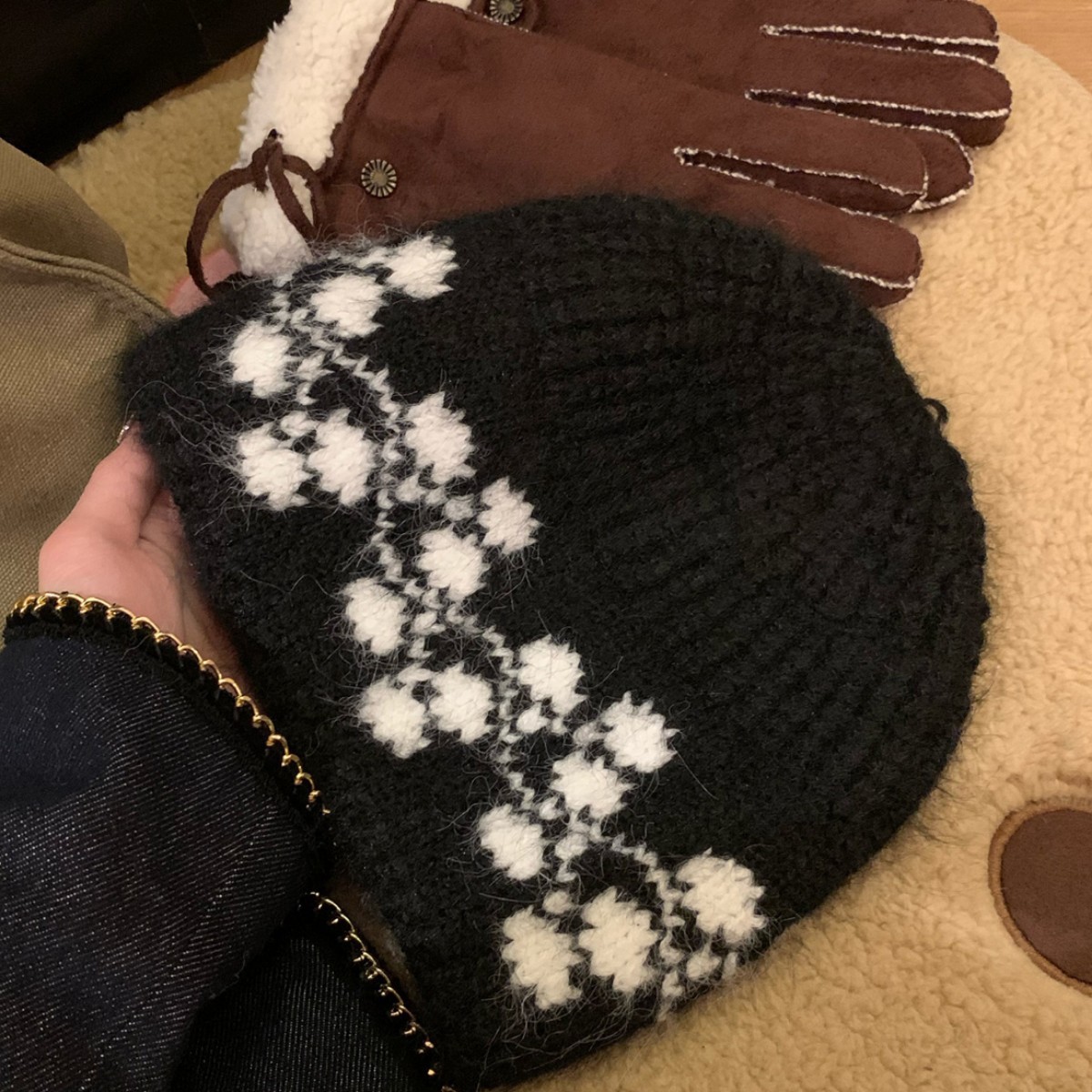 黑色花朵手工针织帽女秋冬季保暖护耳冷帽显脸小时尚毛线帽包头帽