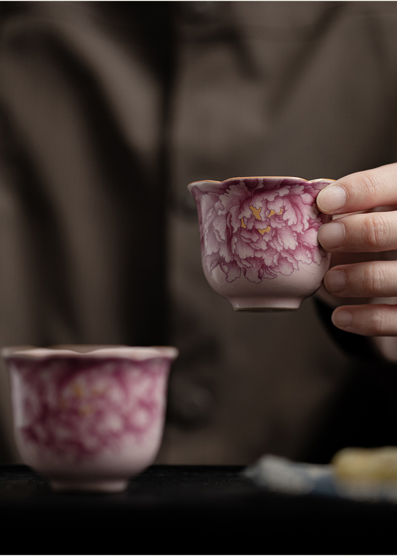 ピンクの汝窯牡丹の花の口の杯の家庭用陶磁器はお茶の杯の主人の杯を飲みます。