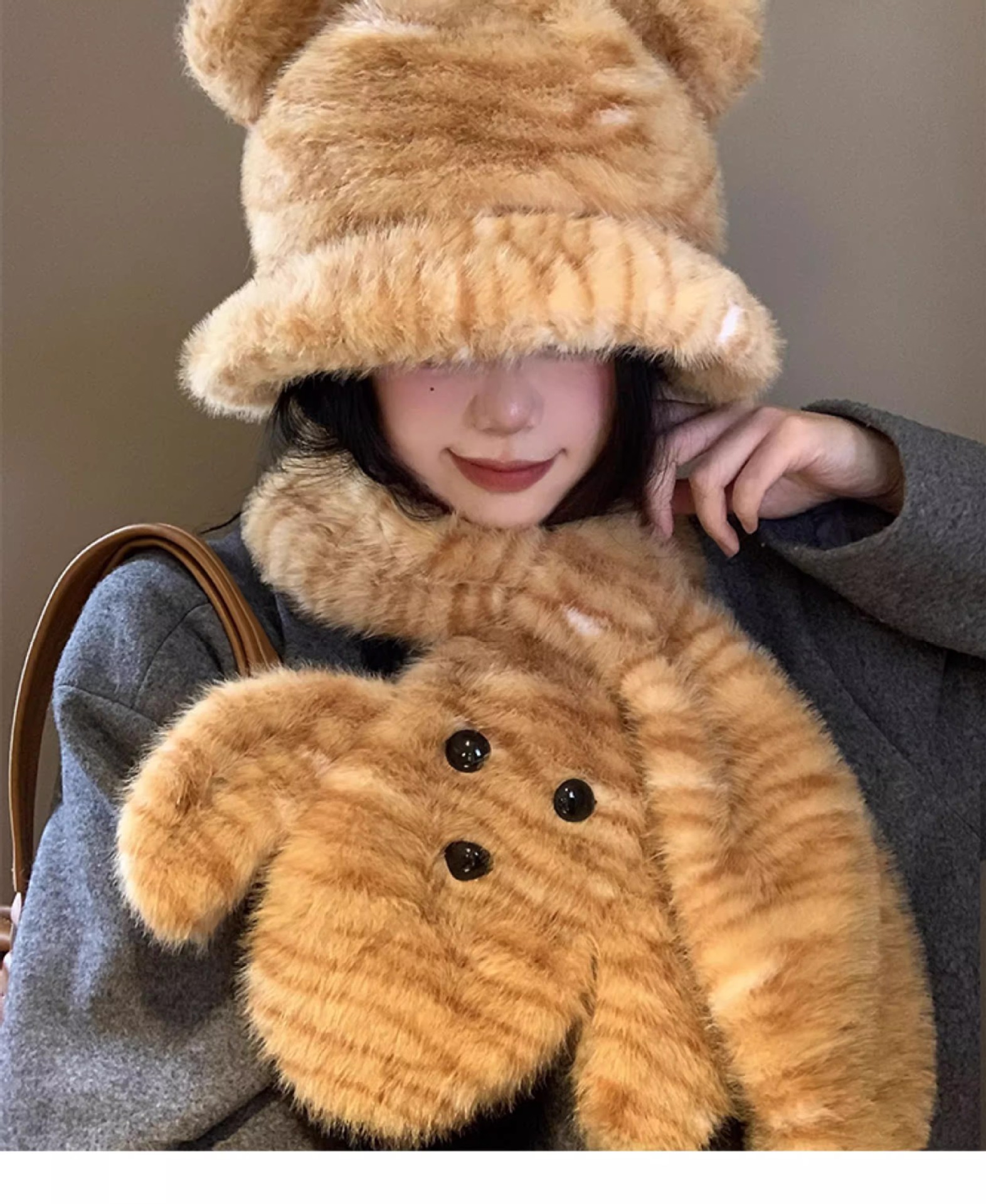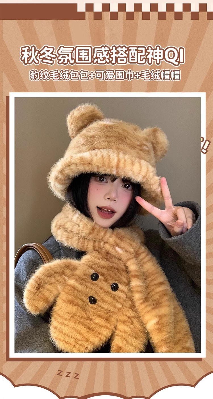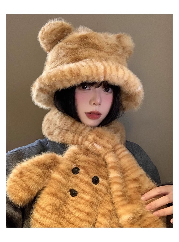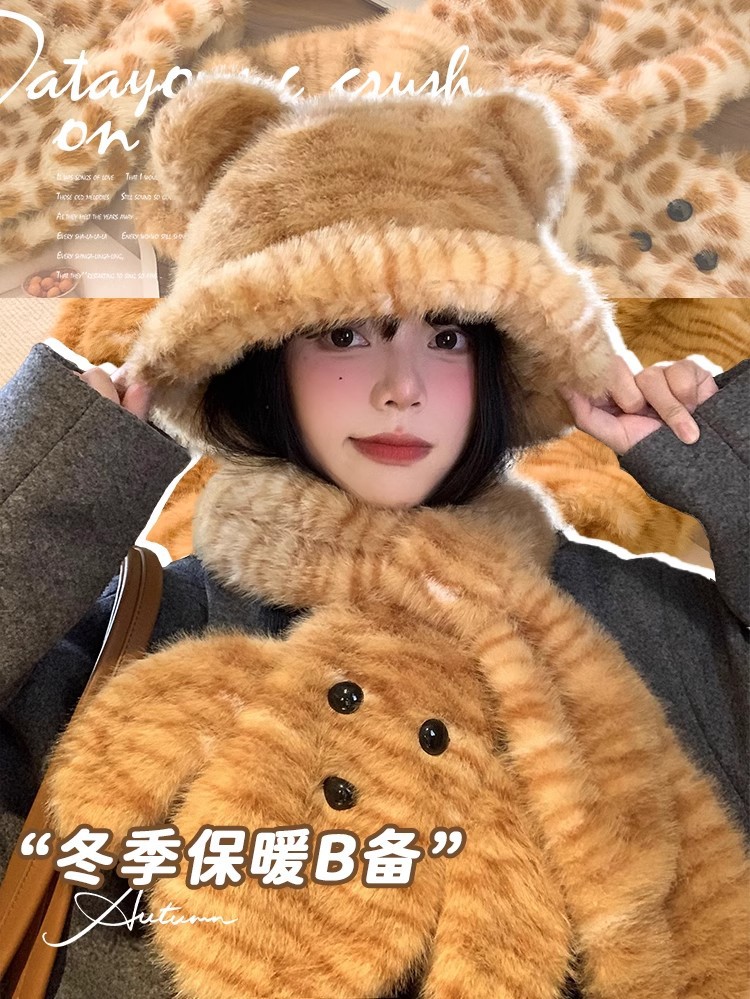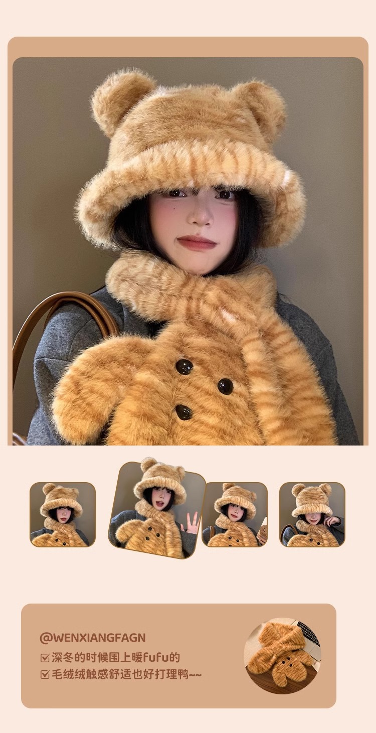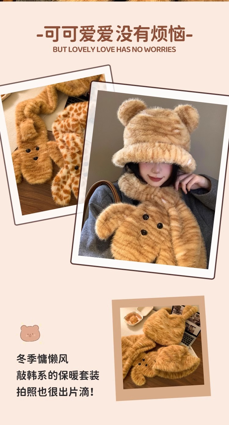 可爱小熊耳朵毛绒帽子围巾一体女冬季加绒加厚保暖防寒护耳雷锋帽