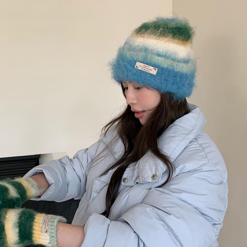 渐变毛茸茸针织帽女秋冬保暖护耳百搭包头帽大头围显脸小毛线帽子