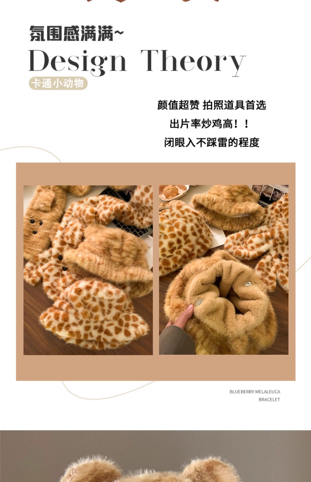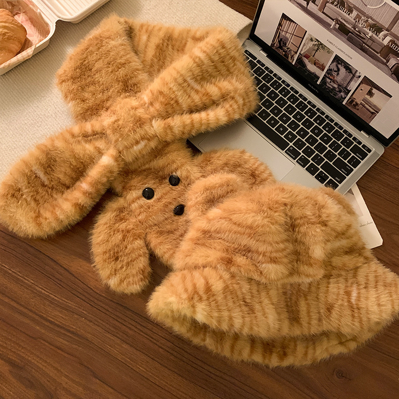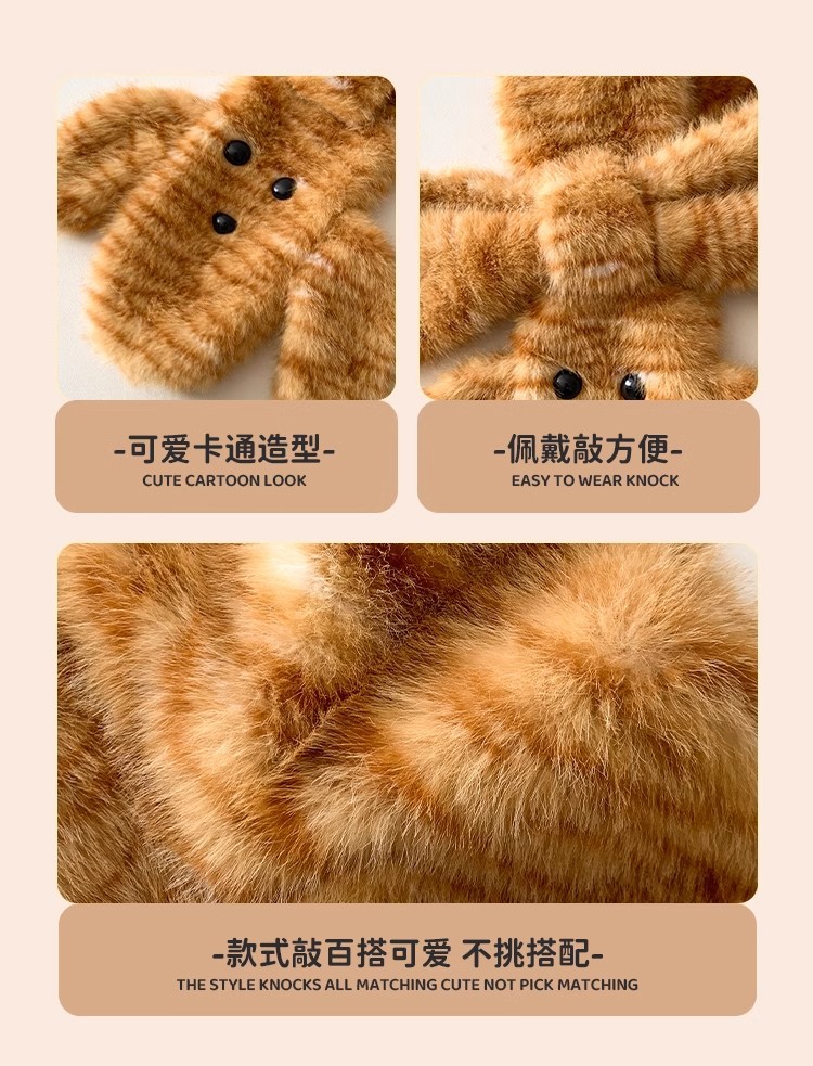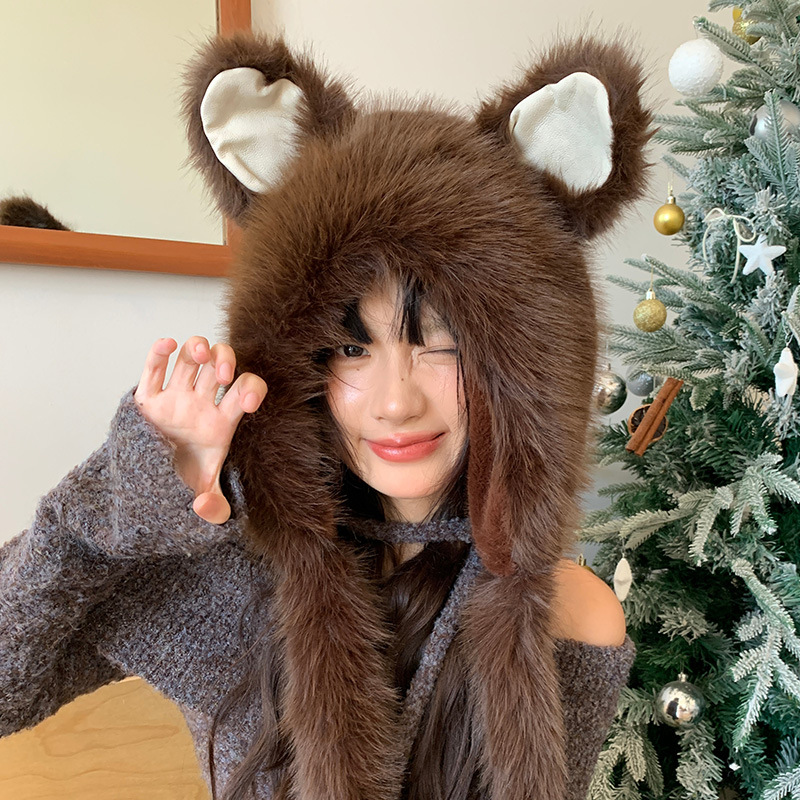 可爱咖色小熊耳朵小鱼毛绒护耳帽女冬显脸小保暖防寒针织雷锋帽子