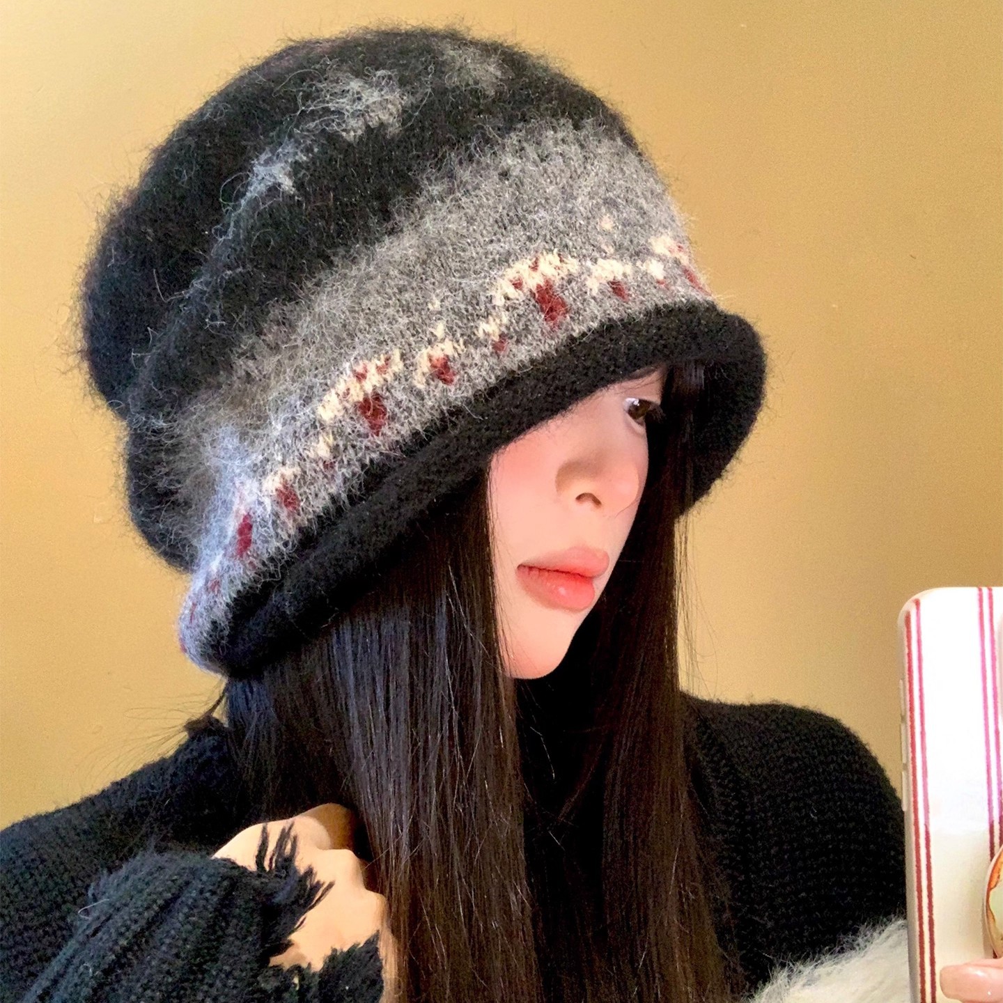 费尔岛撞色针织毛线帽女秋冬季百搭大头围显脸小护耳保暖套头帽子