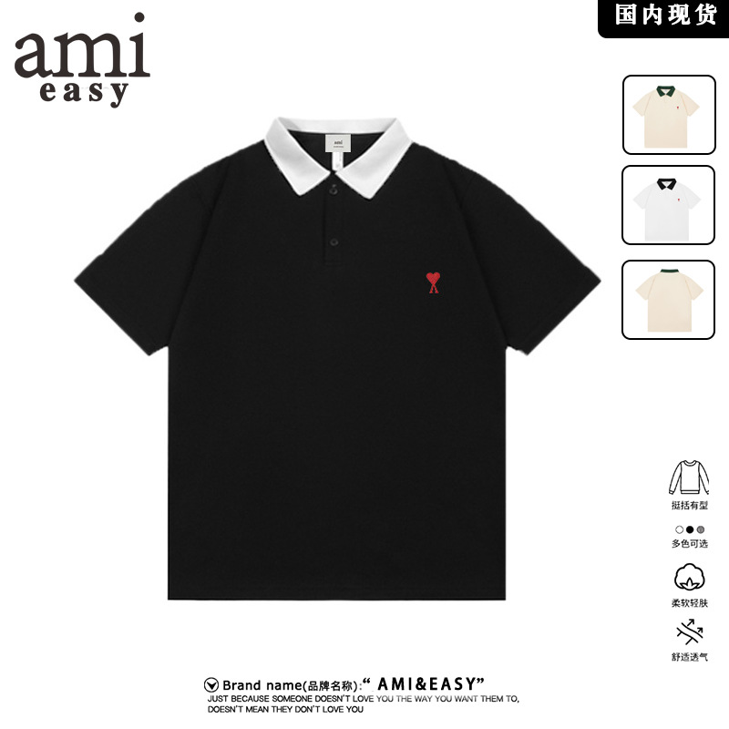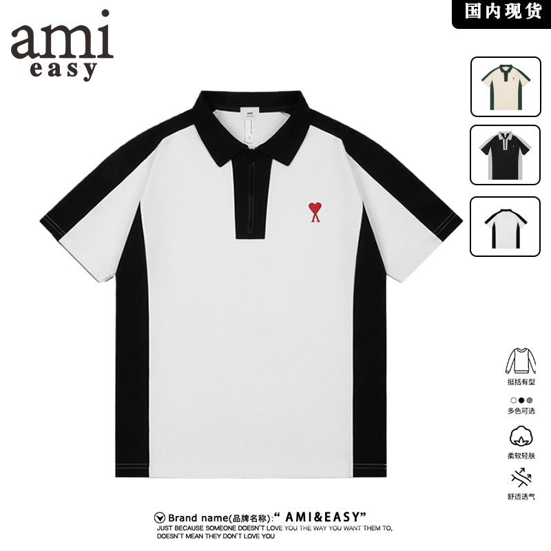 AMI & ARRTアメリカのレトロな衝突色の襟刺繍男性半袖夏カジュアルシンプルな上着青年