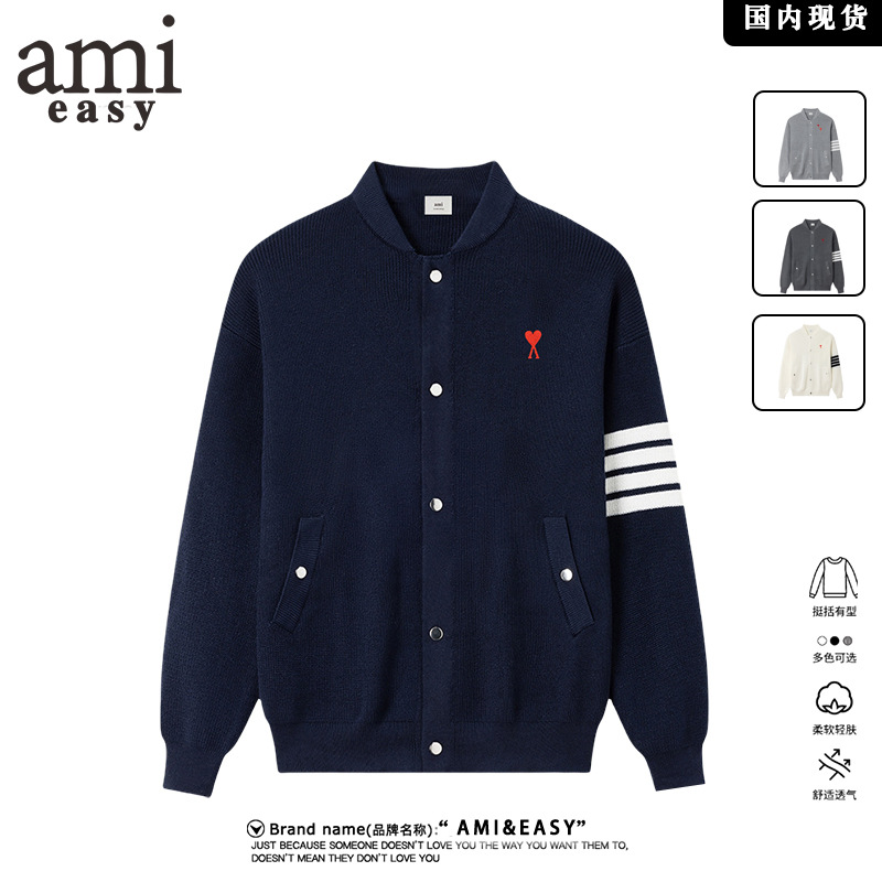 AMI&EASY2025 トレンディな新製品刺繍入り 3 バー セーター メンズ 冬 暖かい シンプル カジュアル セーター ジャケット