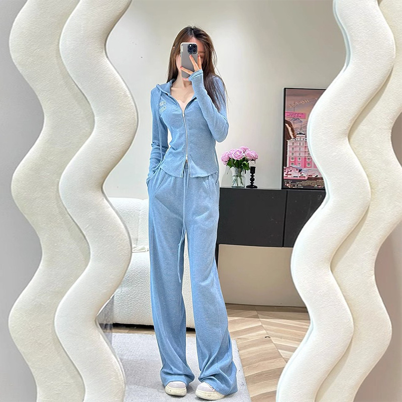 2024年韓国版早秋新作ファッションフード付きカジュアルスーツ女性スリムスリムロングパンツ2点セット長袖