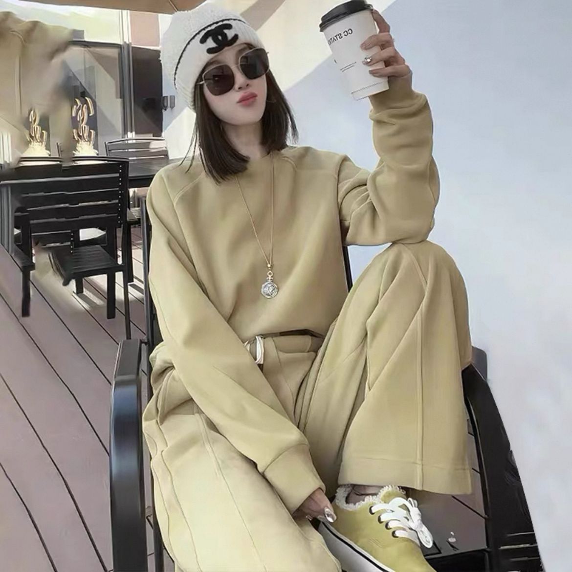 2025年秋冬新作 欧風スポーツウェア レディース おしゃれでスタイリッシュな裏起毛厚手カジュアルワイドパンツツーピースセット