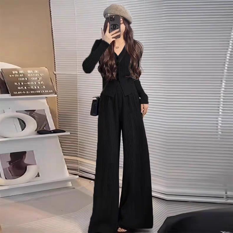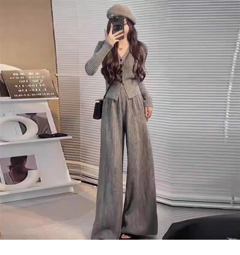 2025年秋新作 韓国風おしゃれセットアップ レディース グレーVネック長袖トップス ワイドパンツ ツーピース