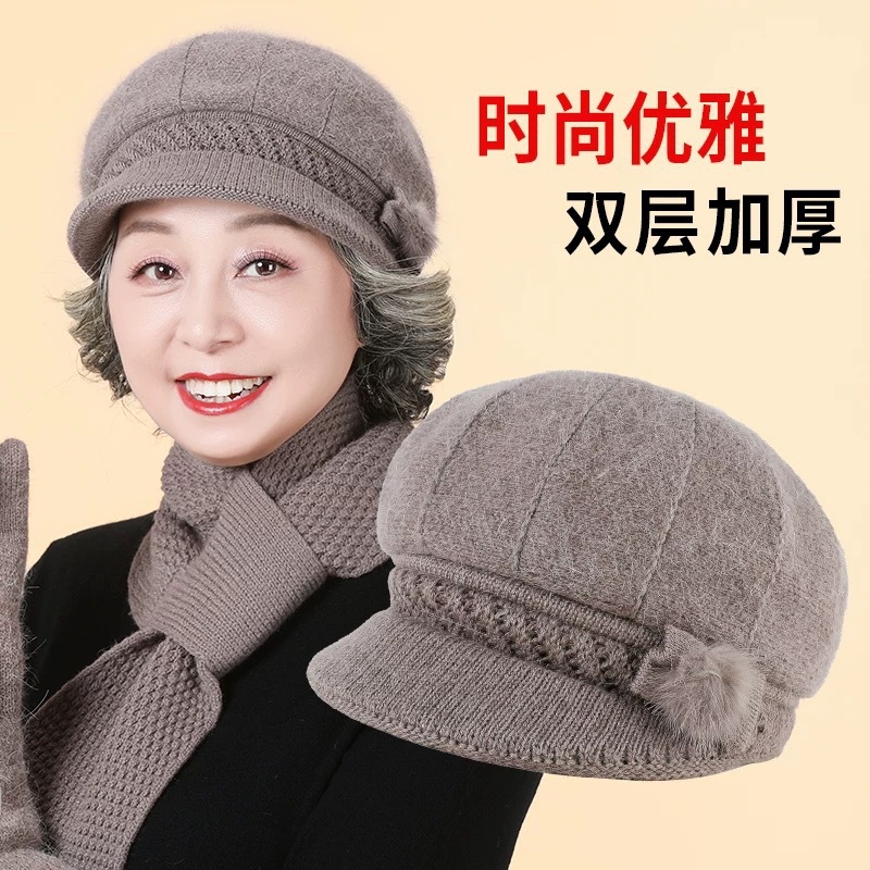 中老年人冬季针织毛线帽女妈妈防风兔毛帽老太太加绒鸭舌保暖帽