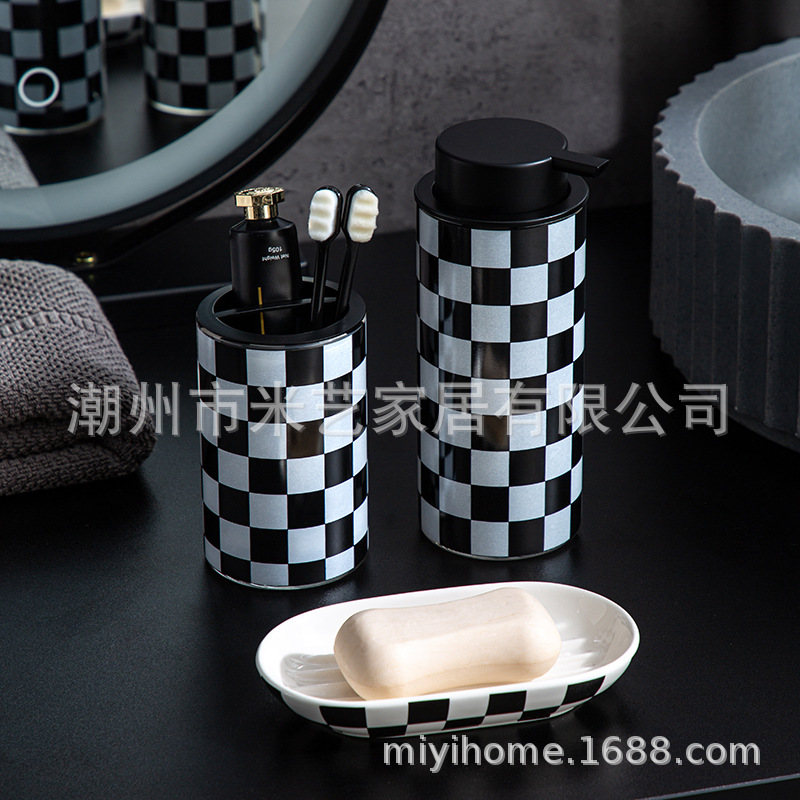 2025 新しいクロスボーダー黒と白の市松模様のガラス発泡手指消毒剤プレスボトル浴室洗浄 3、4、5 点セット