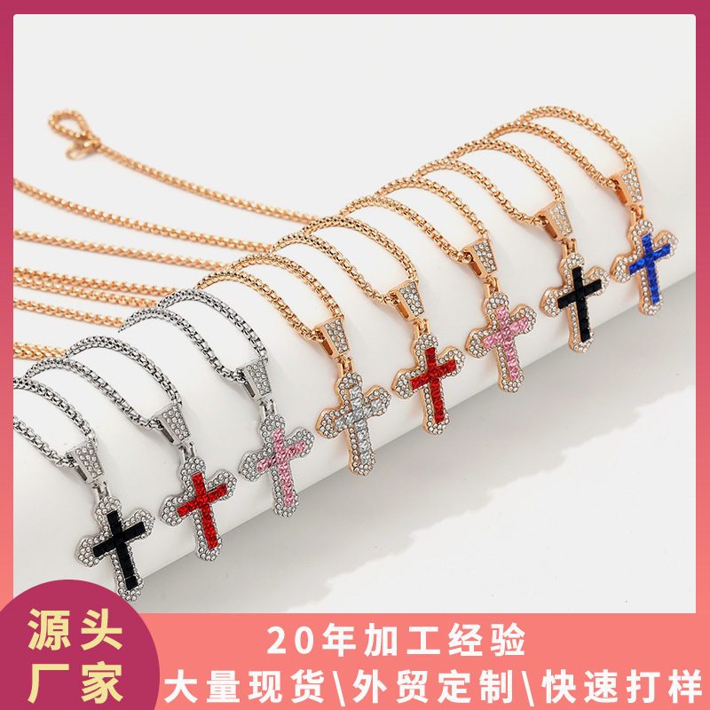 百搭多色锆石吊坠跨境欧美满钻十字架项链嘻哈潮流饰品十字架项链