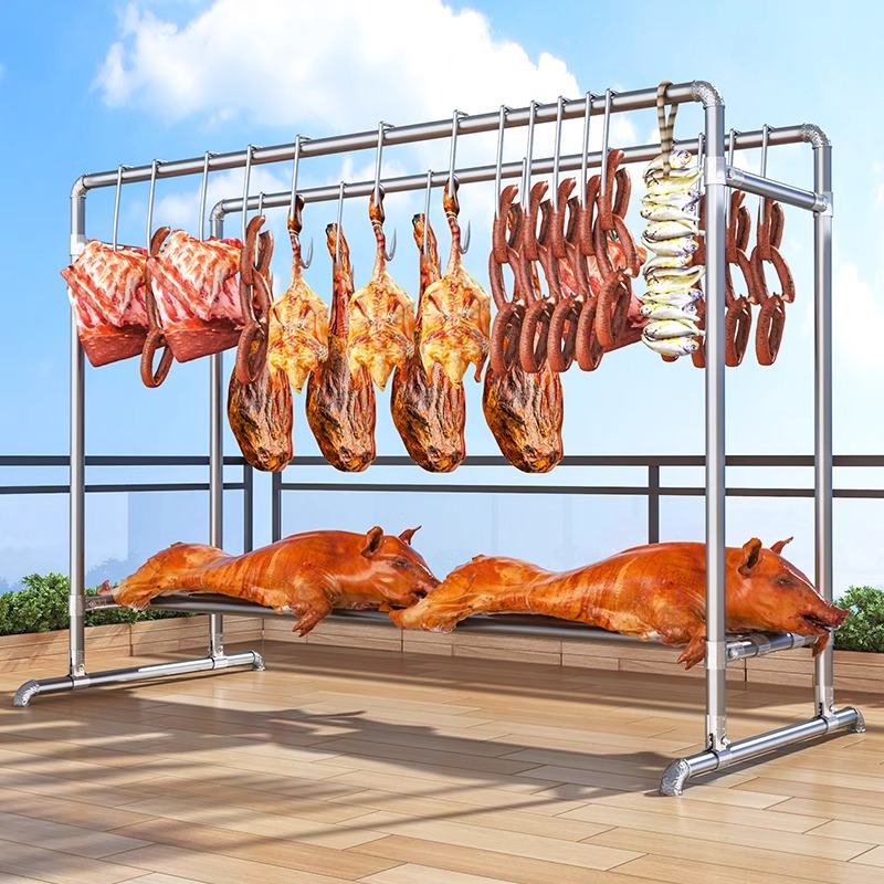 肉をかける専用の棚が床に落ちる家庭用豚肉のベーコンを干してアヒルのソーセージを焼きます。