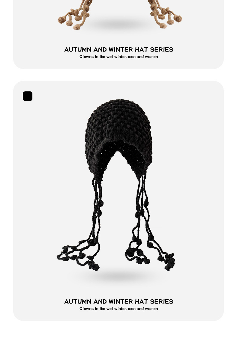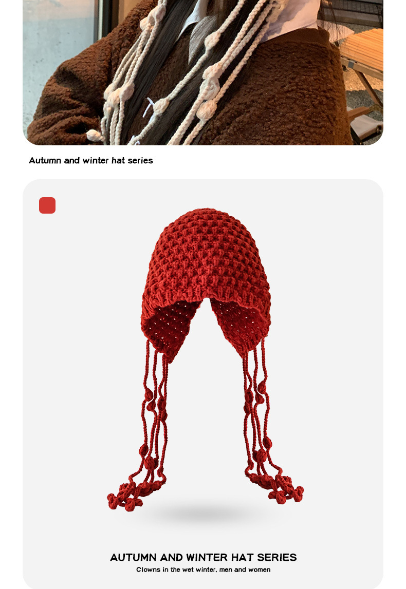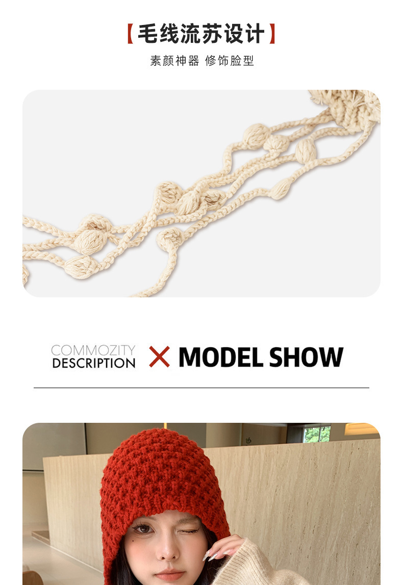 日系时尚百搭护耳毛线帽女彩色球球流苏手工针织帽秋冬保暖包头帽