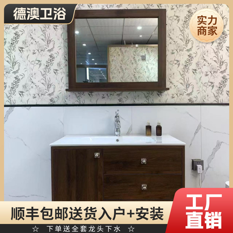 新款中古风胡桃木陶瓷一体盆浴室柜组合卫生间洗漱台洗手洗脸盆柜