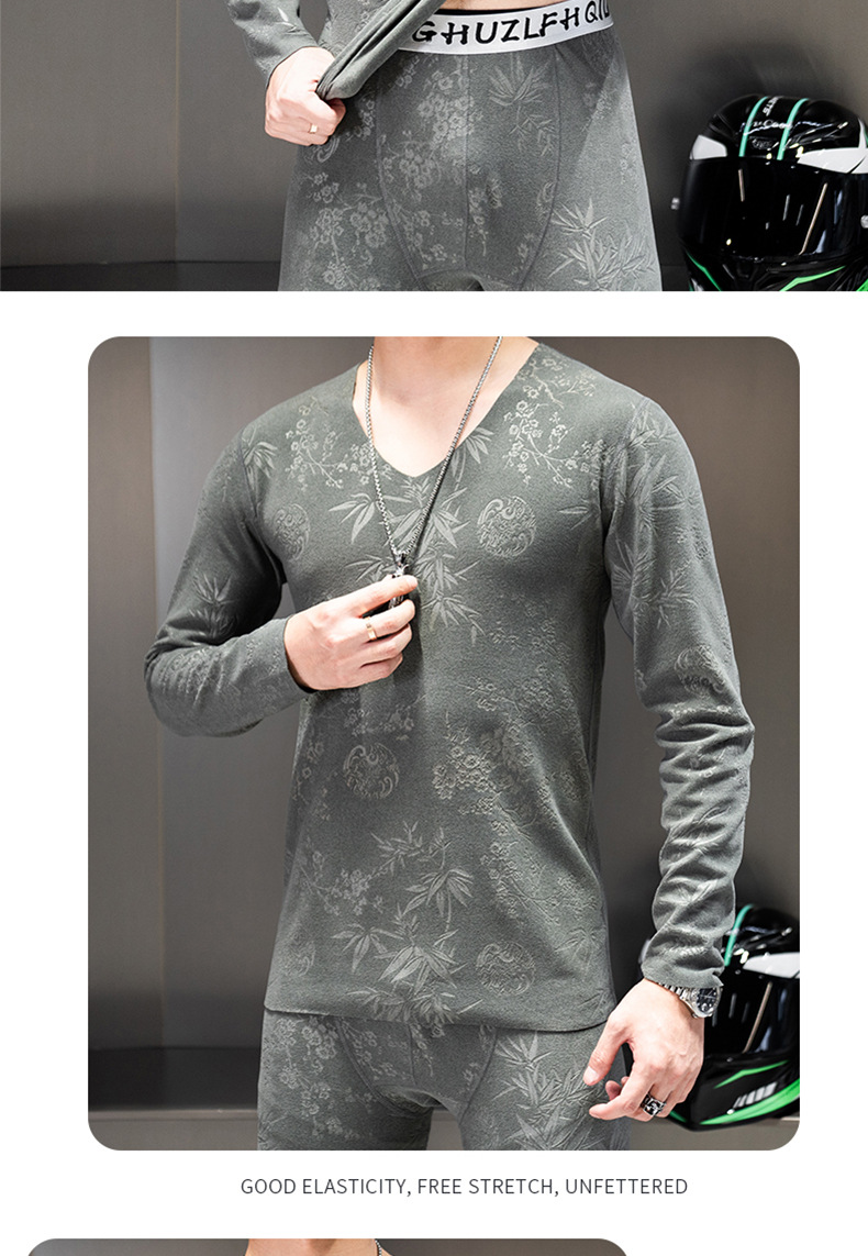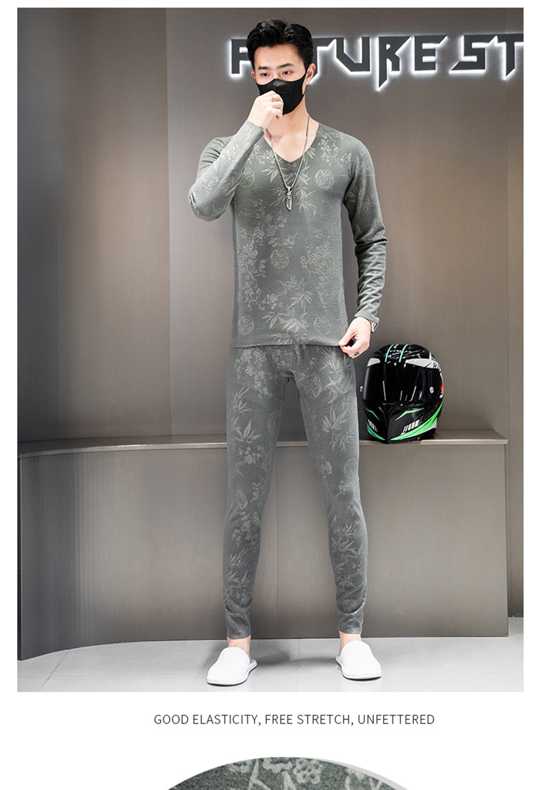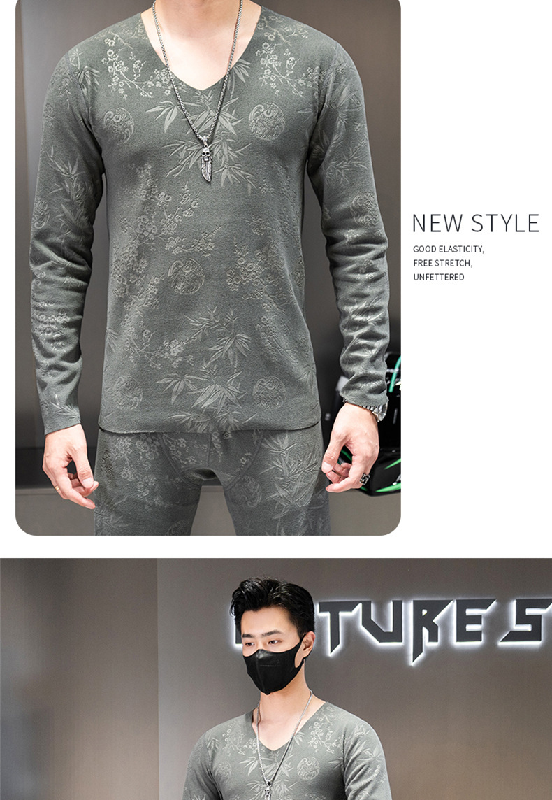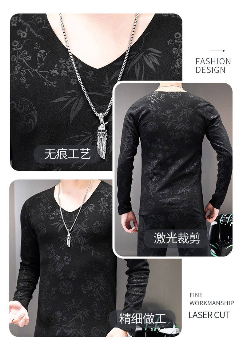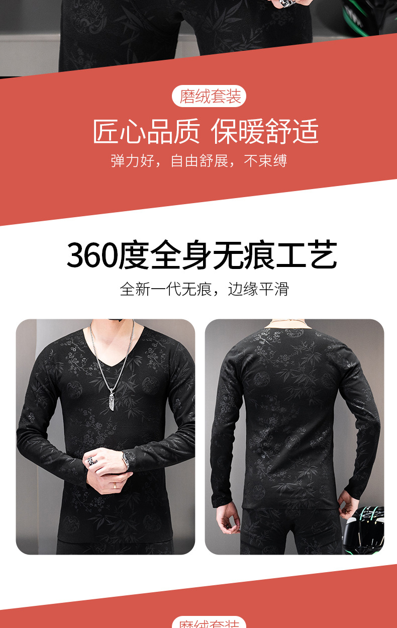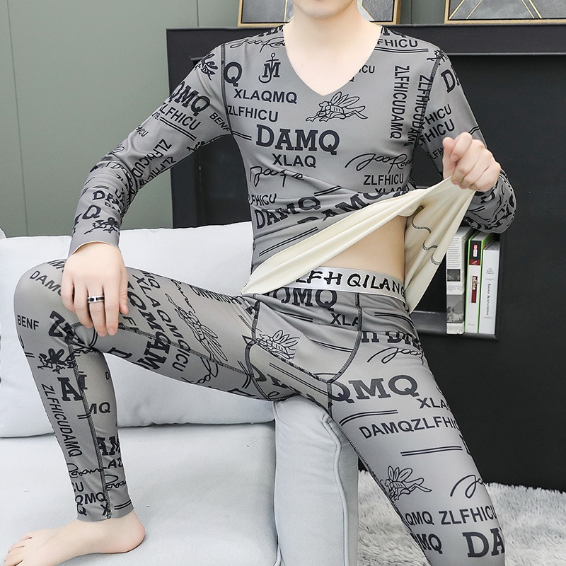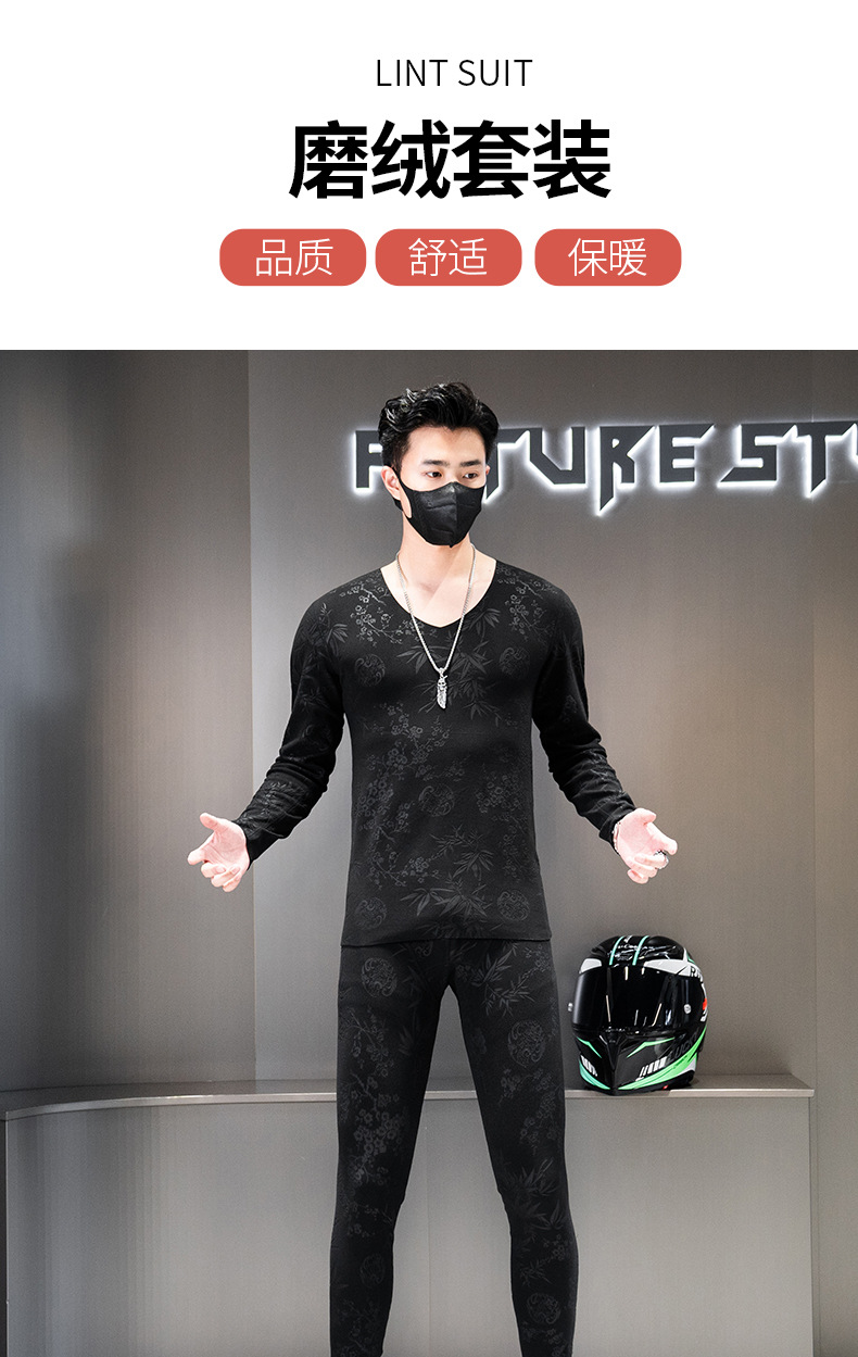 无痕双面德绒男士保暖内衣套装V领潮流时尚印花秋冬季秋衣裤秋裤