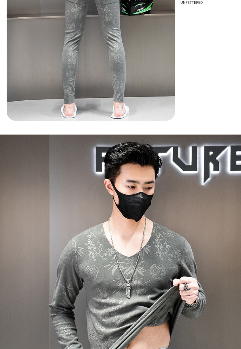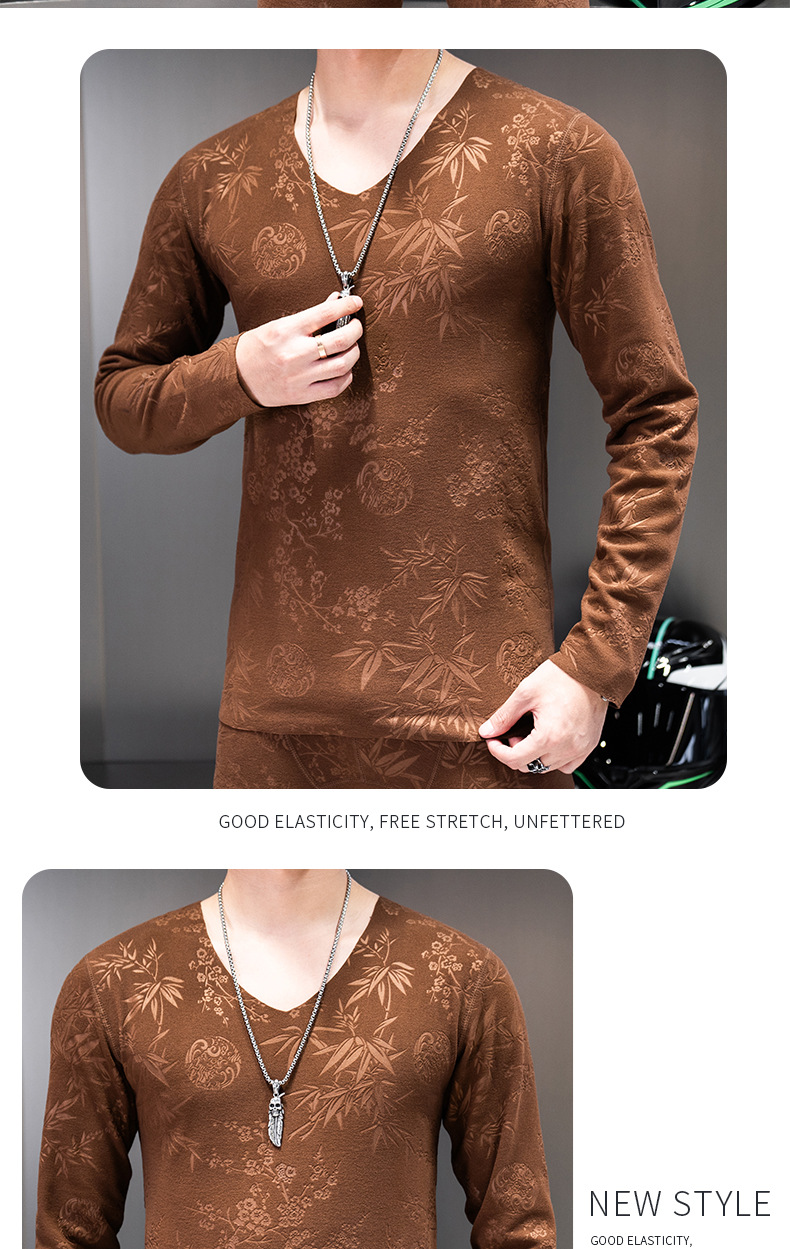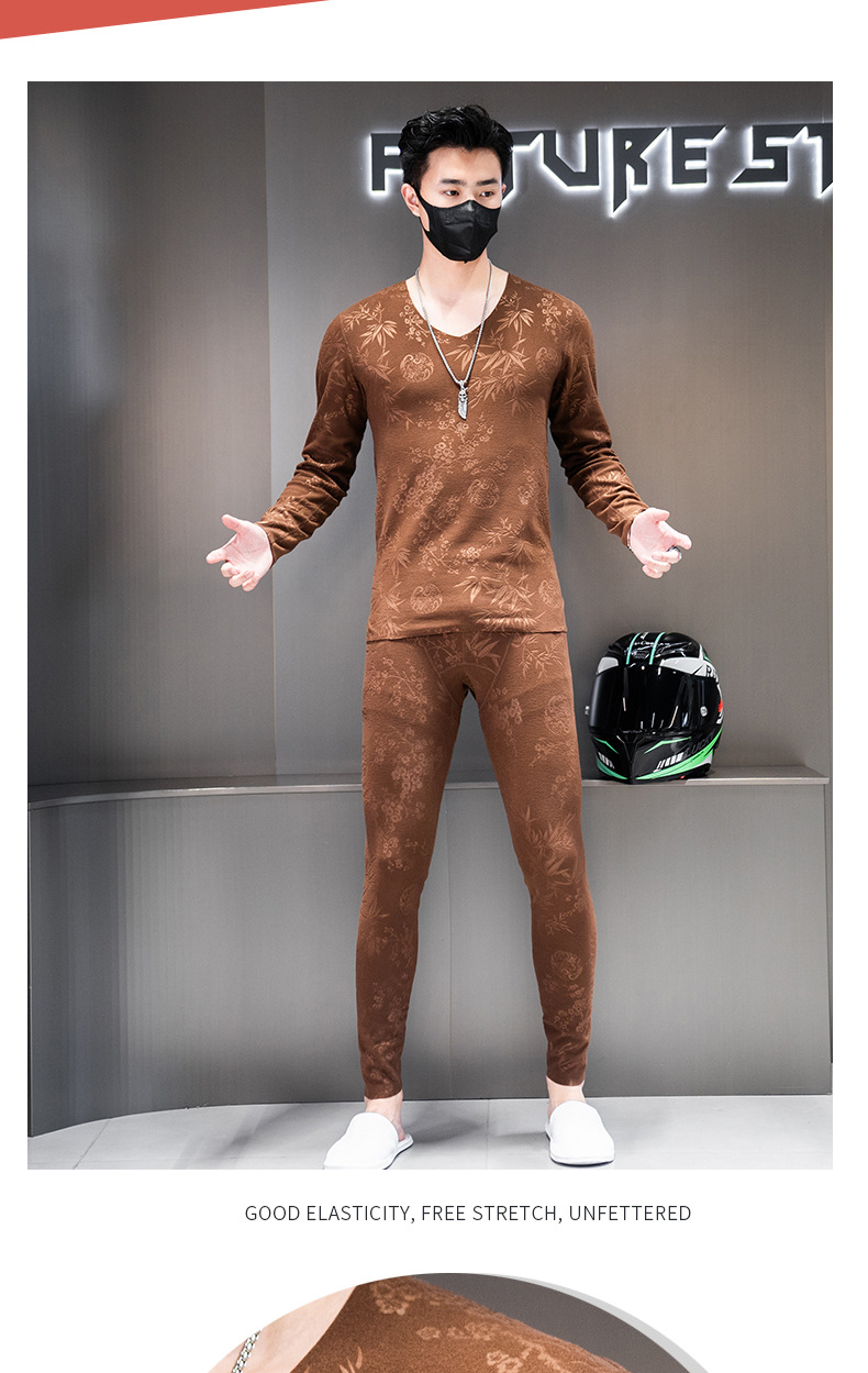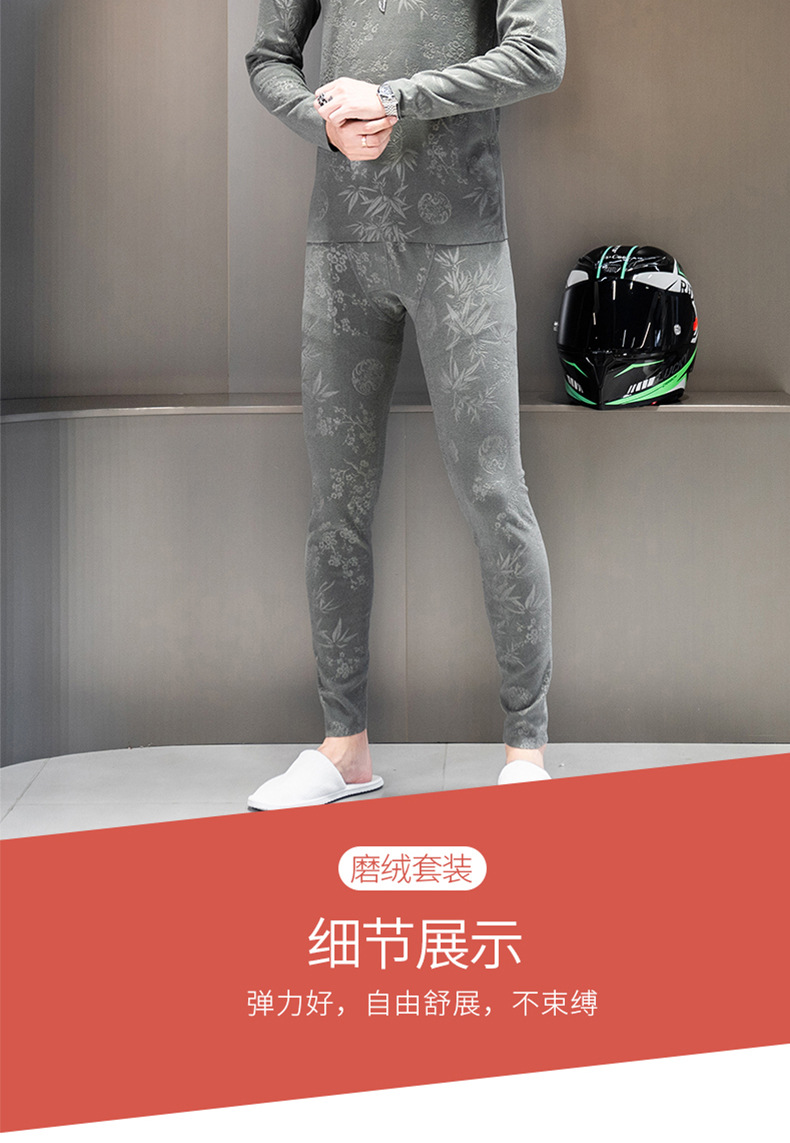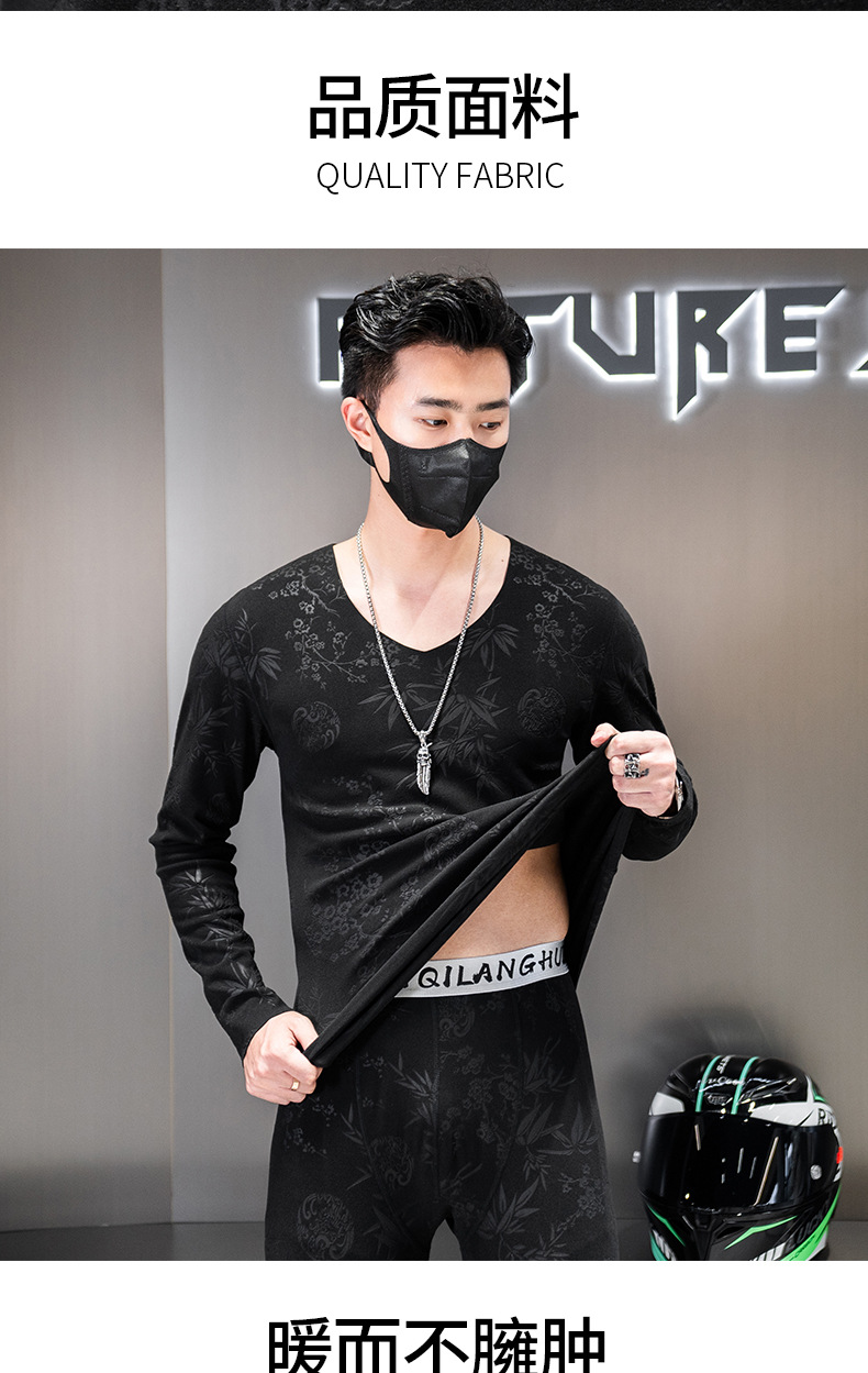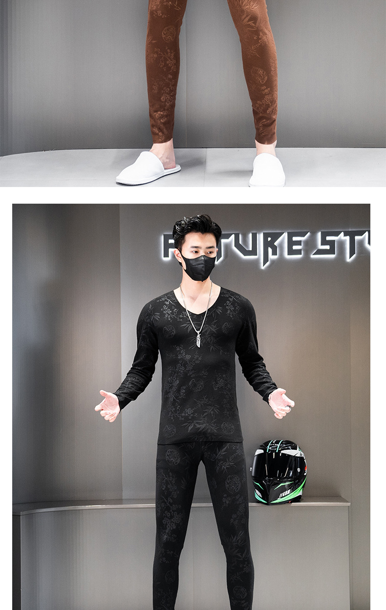 无痕双面德绒男士保暖内衣套装V领潮流时尚印花秋冬季秋衣裤秋裤