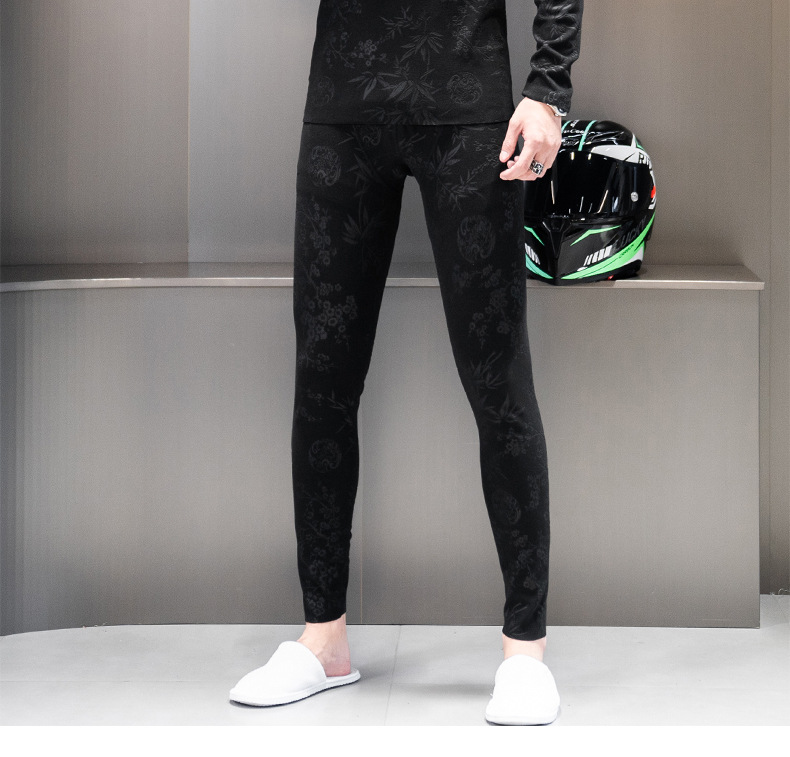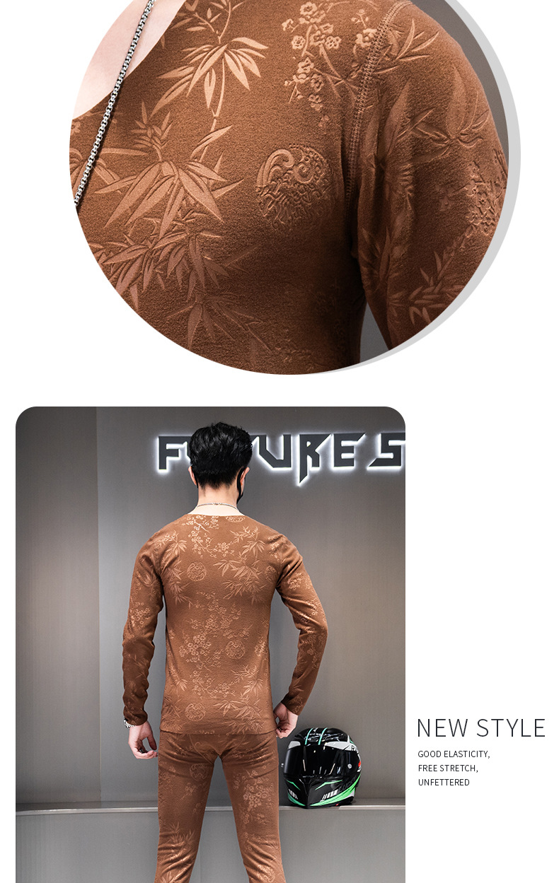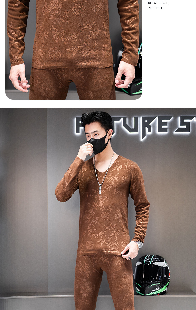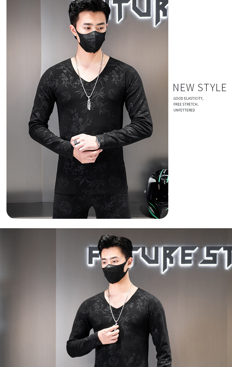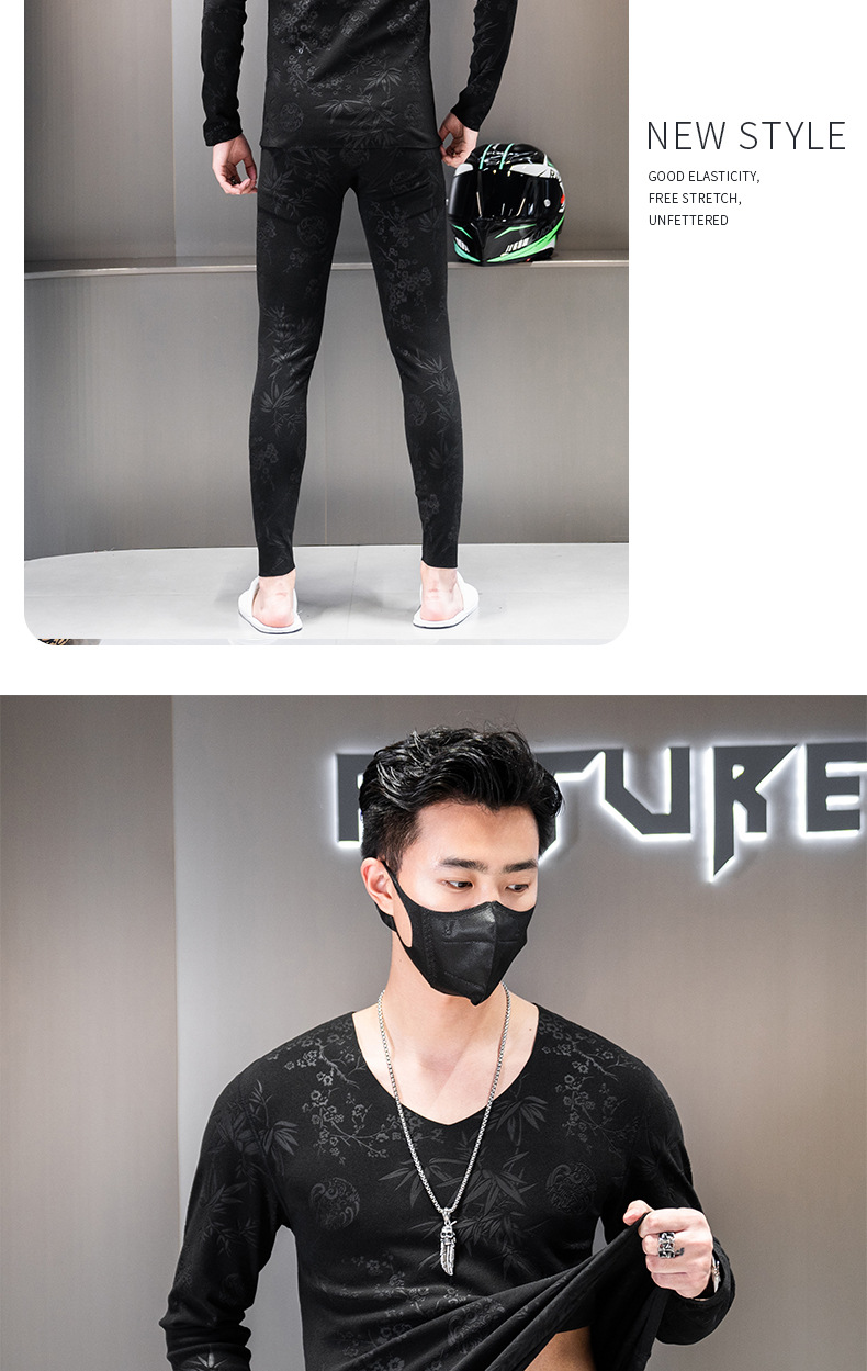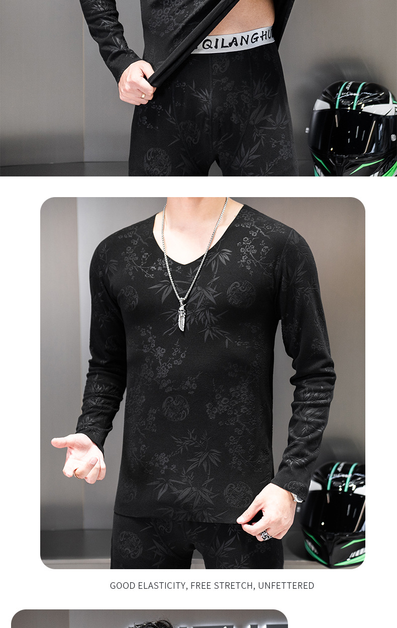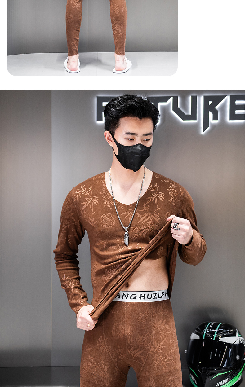 无痕双面德绒男士保暖内衣套装V领潮流时尚印花秋冬季秋衣裤秋裤