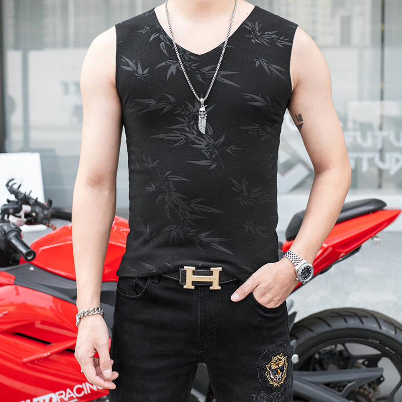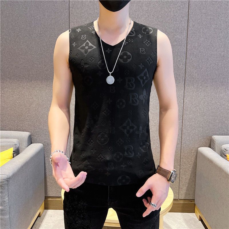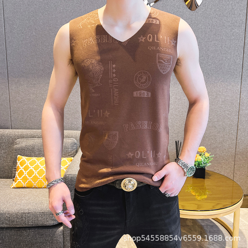 男性の両面パイル無痕vネックプリントベスト秋冬ベルベット青少年保温底袖なしtシャツ