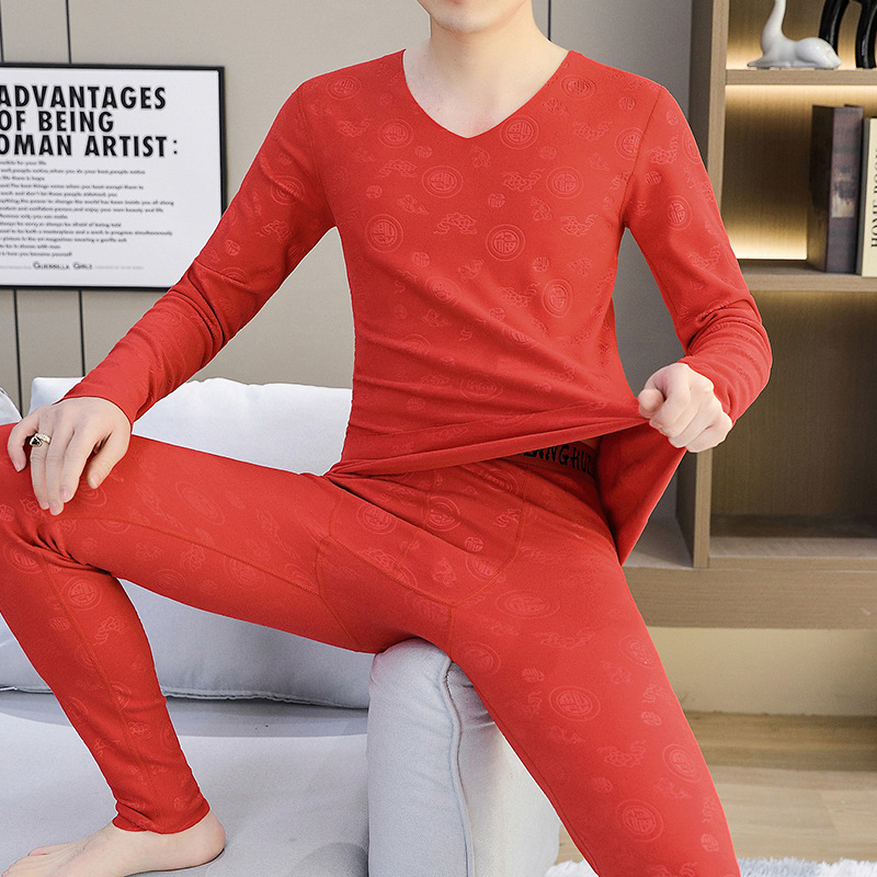 保暖内衣男士本命年大红色冬季打底加绒磨毛加厚无痕秋衣秋裤套装