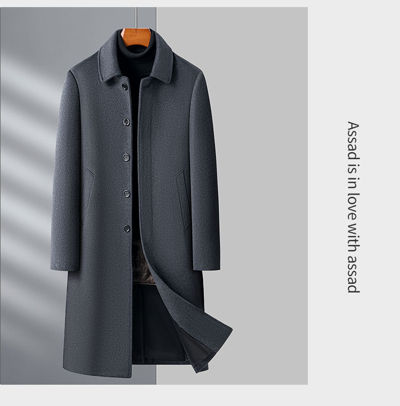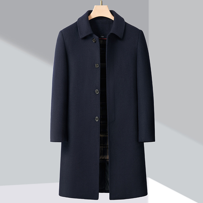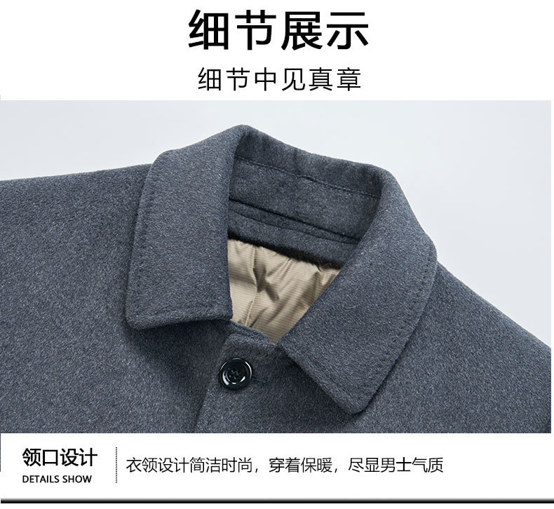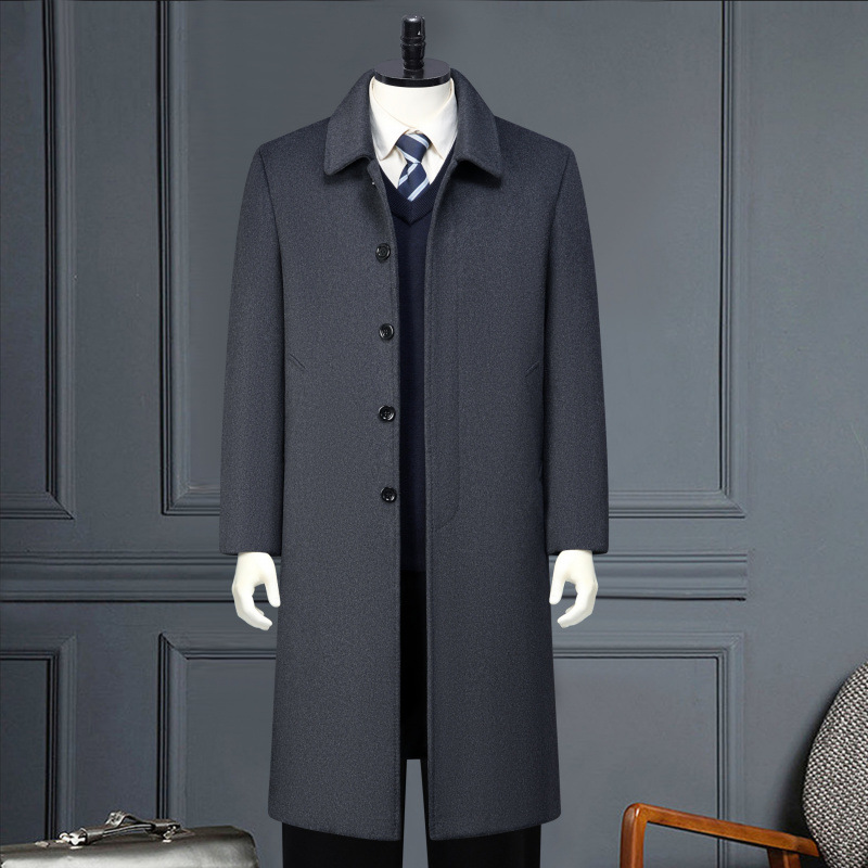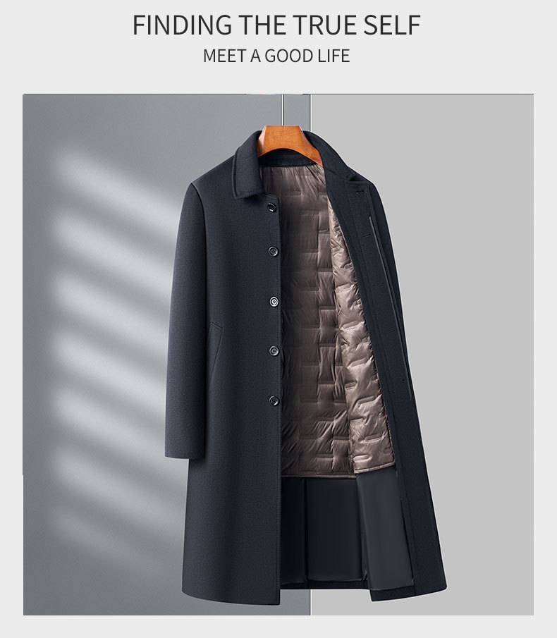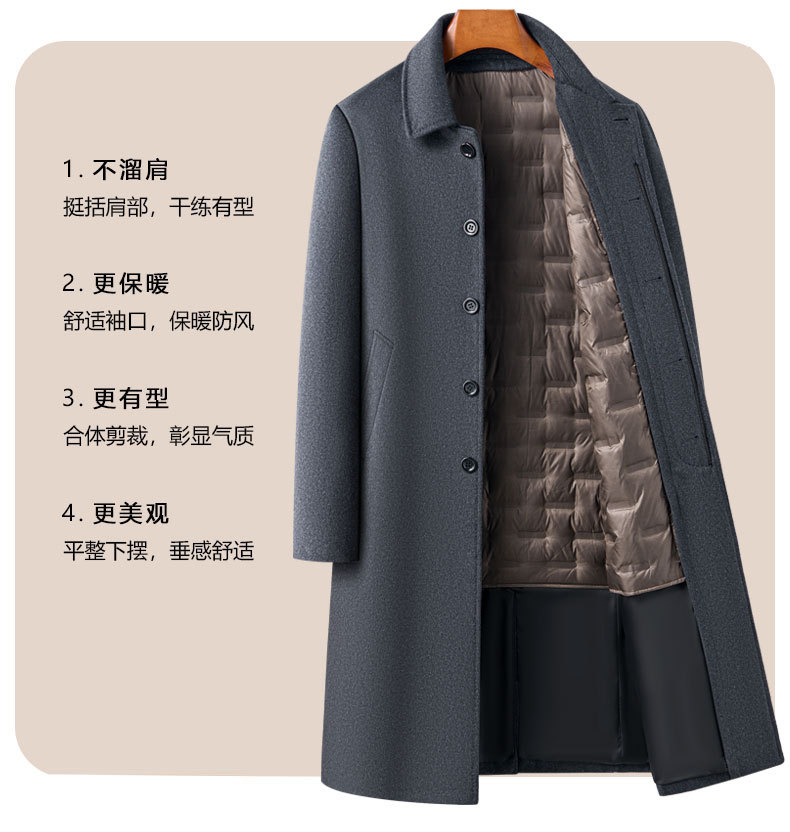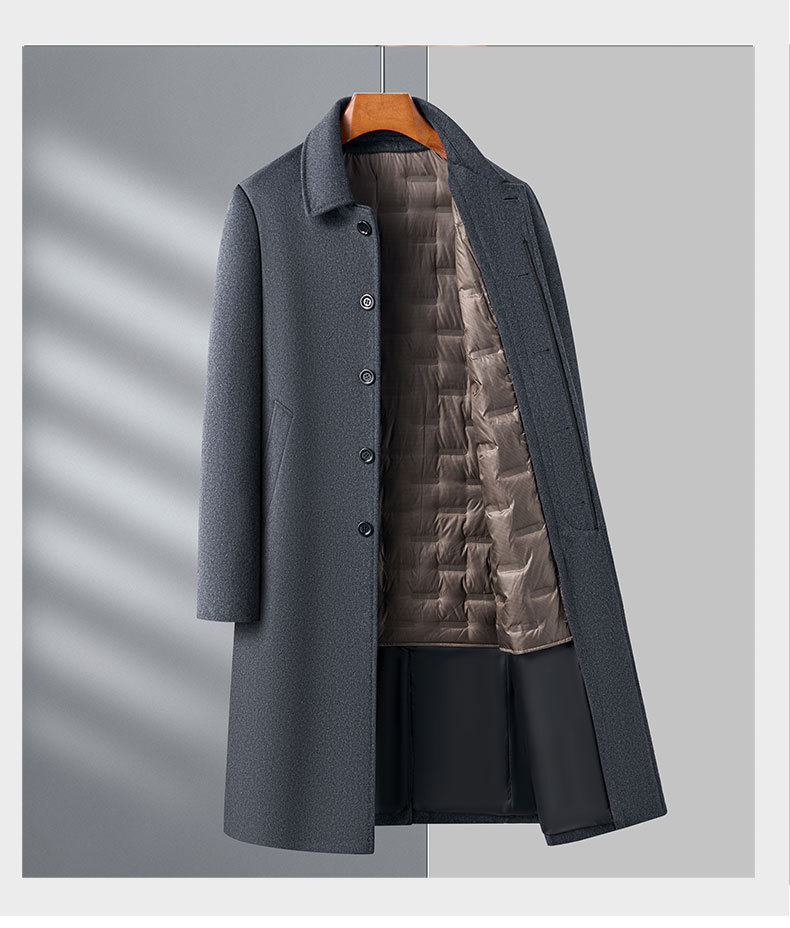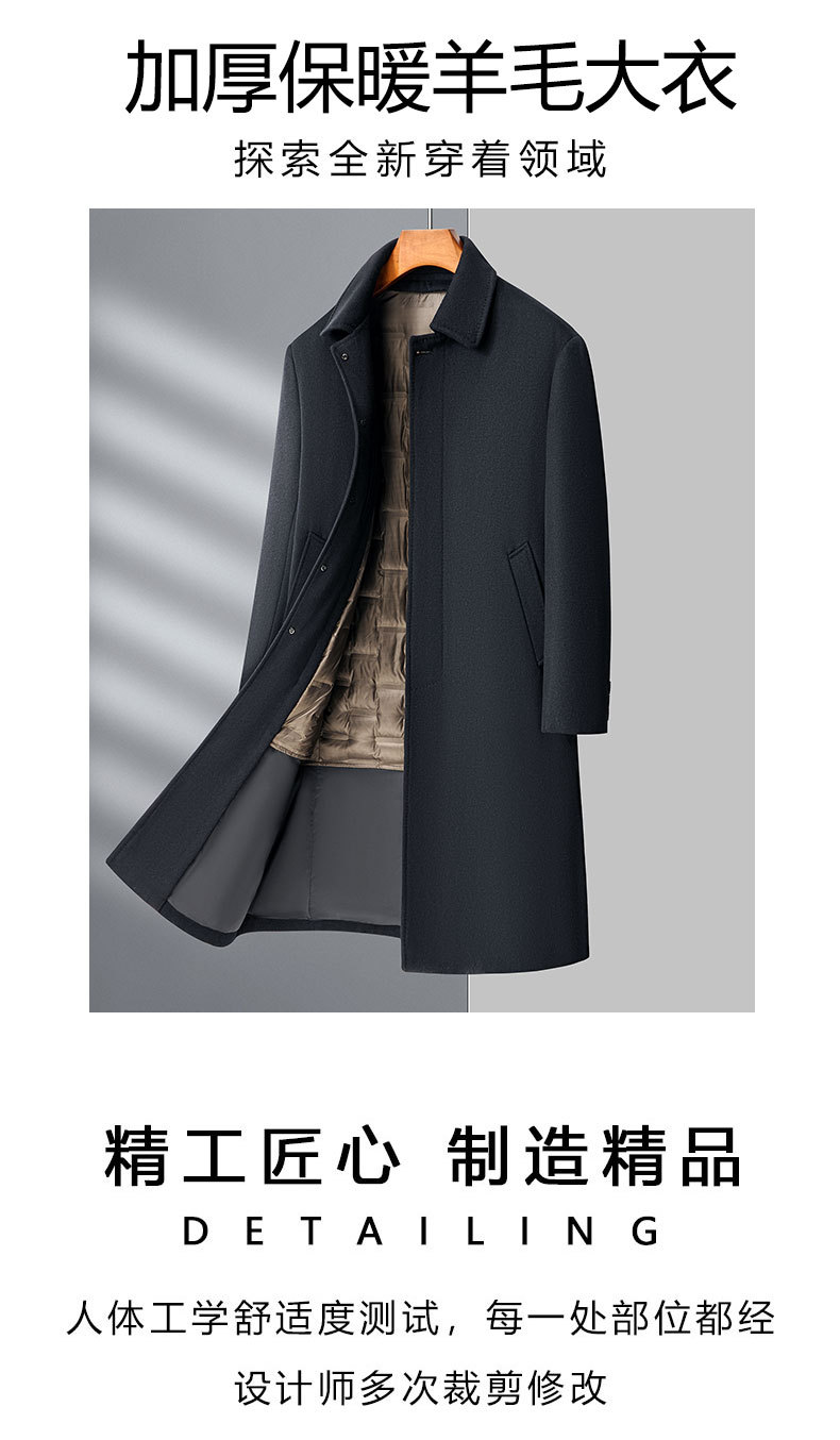 新しい高級ウールコート、メンズロングスタイル、冬の新作、折り返し襟、ダウンインナー、中高年向けウール混紡コート